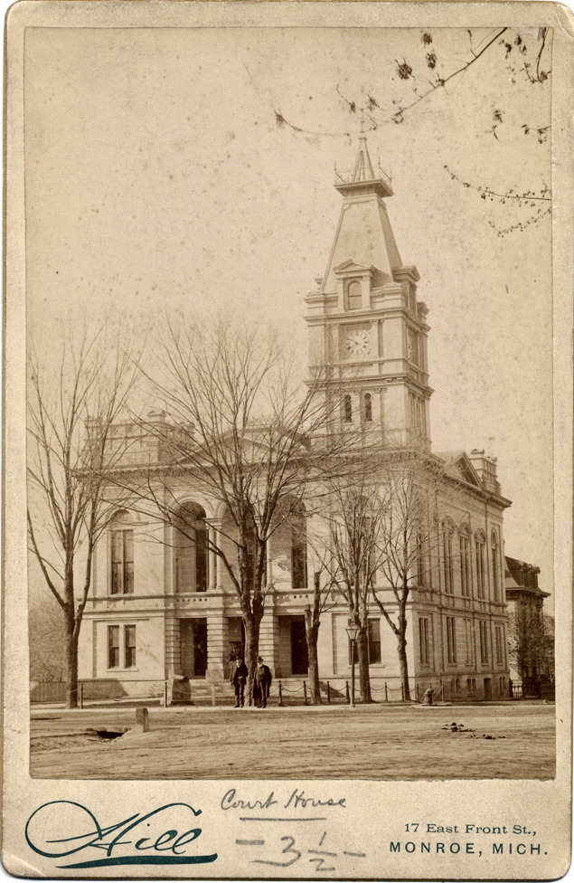 Two substantial-looking men in front of courthouse, which has battlemented short towers at corners, ornate clock tower at nearest corner. Handwritten on front of cabinet card: "Court House." Printed on front of cabinet card: "Hill, 17 East Front St., Monroe, Mich." Printed on back of cabinet card: "From C.W. Hill's ground floor studio, 17 Front St., East, Monroe, Mich."