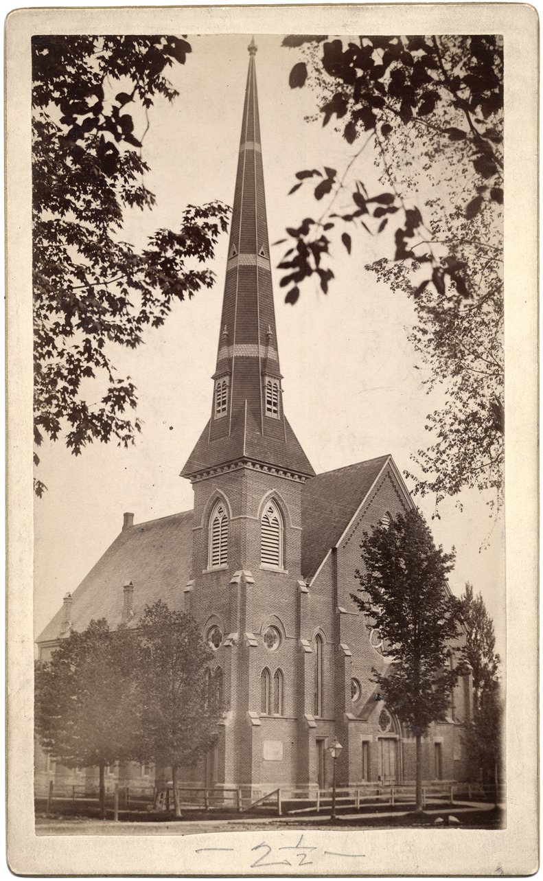 View of the front and one side of a Methodist church in Monroe, Michigan. Written on photo back: "Methodist church."