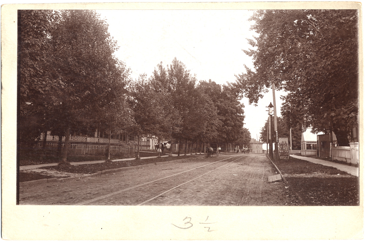View down Cass Avenue in Mt. Clemens, Michigan with houses and trees on either side and horse-drawn vehicles on dirt road. Written on photo back: "Cass Ave., Mt. Clemens."