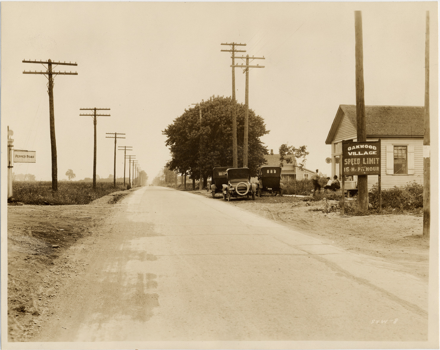 View of unpaved road with residential and other buildings. Several men on steps in front of closest building. Three cars just beyond closest buildings. Signs in photograph: "Pepper Road," "Oakwood Village, speed limit, 15 mi. per. hour." Printed on back: "Spencer & Wyckoff, commercial photographers, Detroit." Handwritten on back: "Oakwood Village-Pepper Rd."