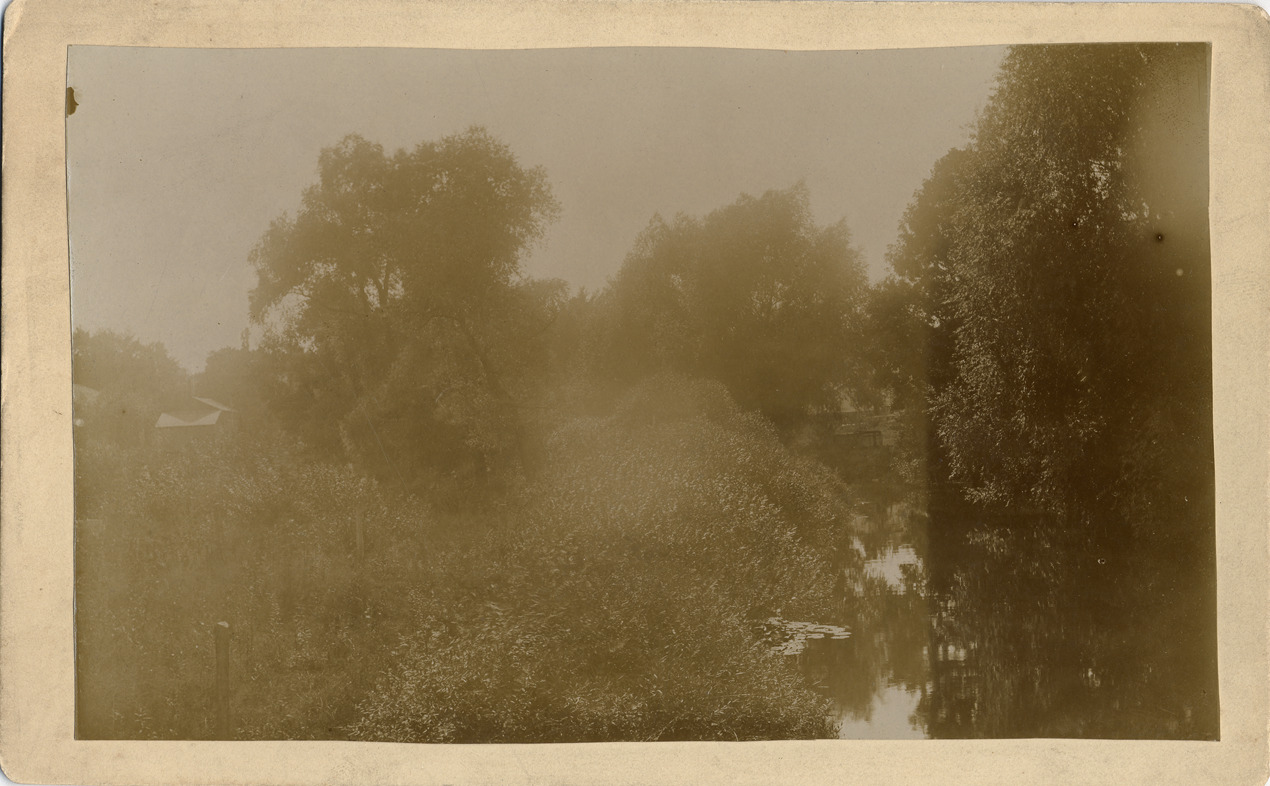 Lily pond, mostly obscured by trees. Handwritten on mat back: "Lily pond, Pontiac."