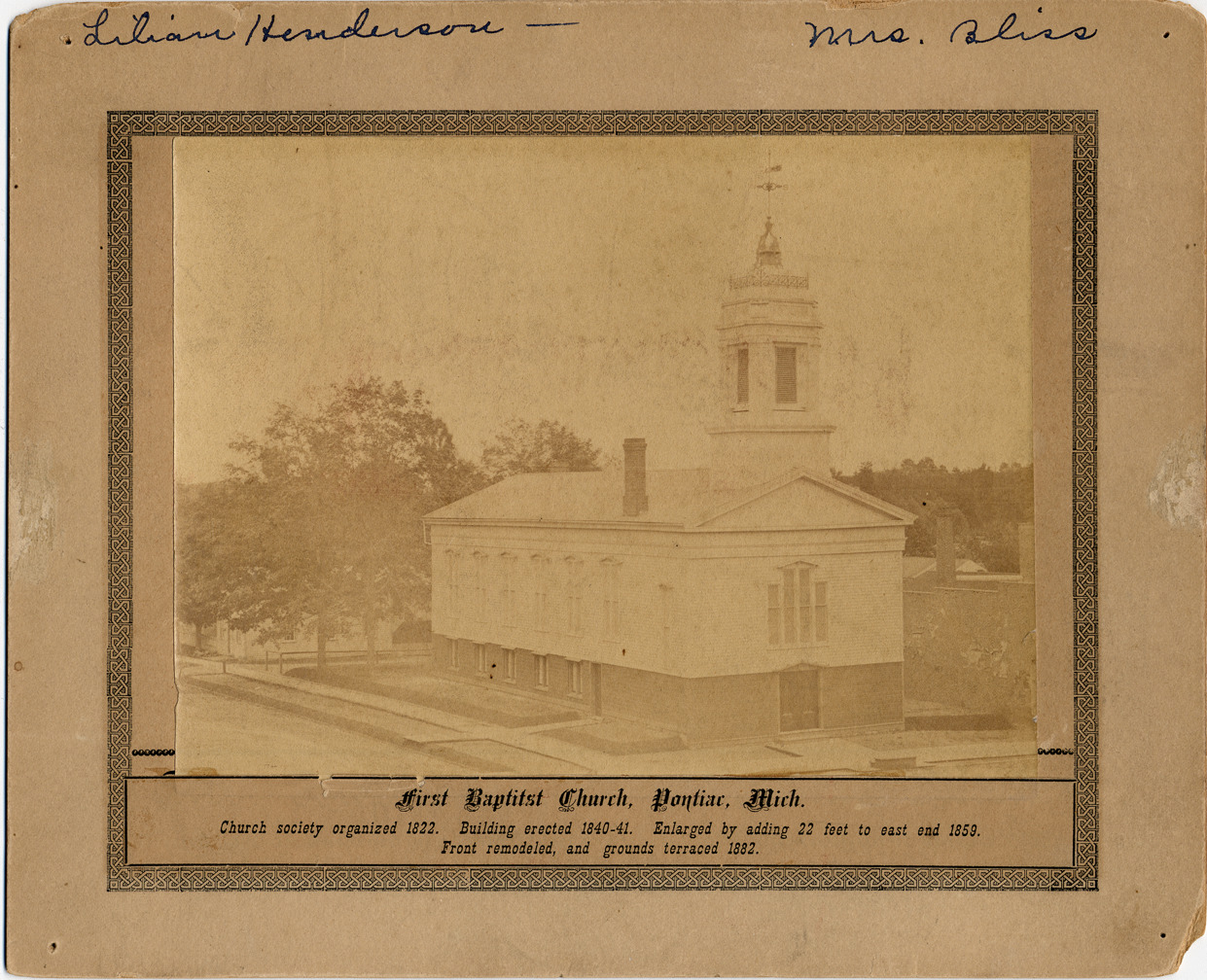 Front and one side of the First Baptist Church in Pontiac, Michigan, with trees in background. Printed on front of photo: "First Baptist Church, Pontiac, Mich., church society organized in 1822, building erected 1840-1841, enlarged by adding 22 feet to east end 1859, front remodeled and grounds terraced 1882."