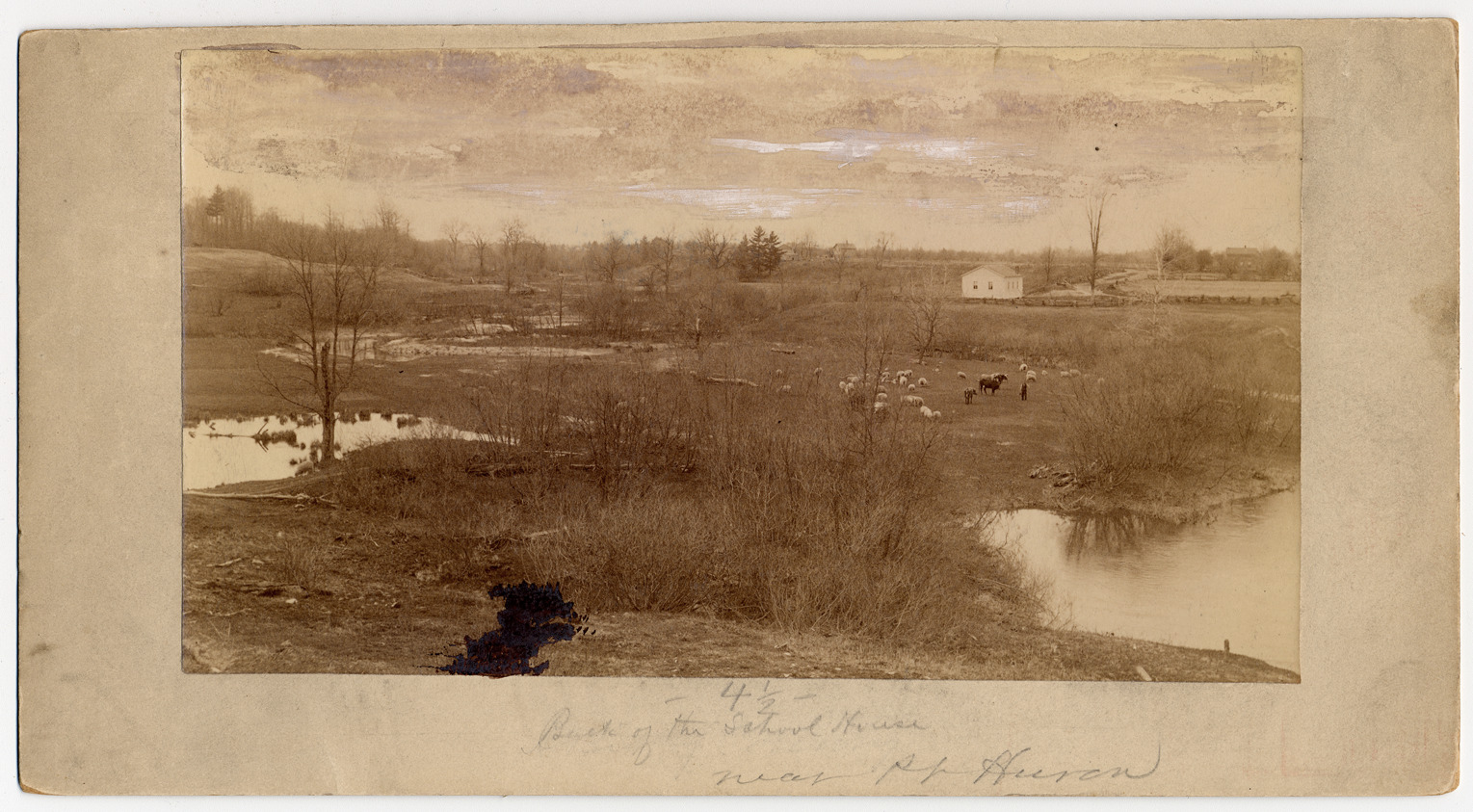 Sheep and cows graze in field near single story, wood frame school house in Port Huron, Michigan. Written on front of photo: "Back of the school house near Pt. Huron."