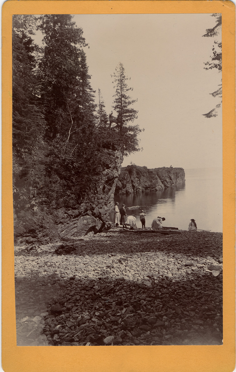 Children stand on rocky beach at Presque Isle Park in Marquette, Michigan, with rocky shoreline and trees stretching out along Lake Superior in background. Printed on photo back: "G.A. Werner, Lake Superior views, Marquette, Mich." Written on photo back: "Presque Isle, Marquette, Mich., Sept. 1890."