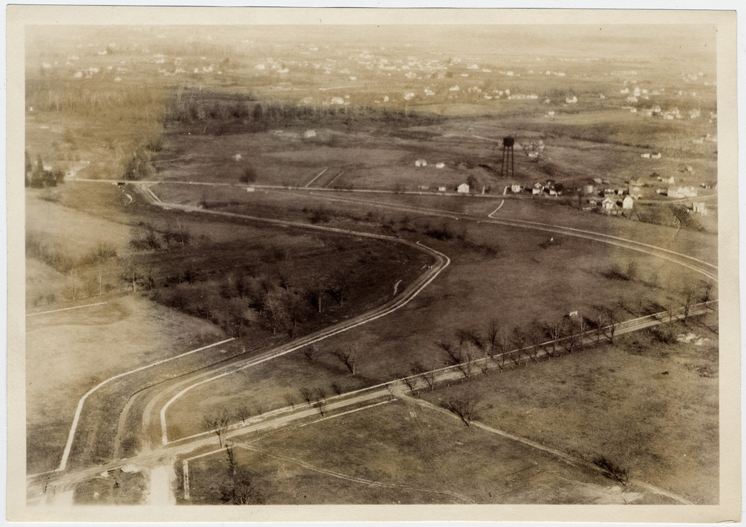 Aerial view of roads, houses and trees at Crooks Road in Royal Oak, Michigan. Written on photo back: "Crooks Road."