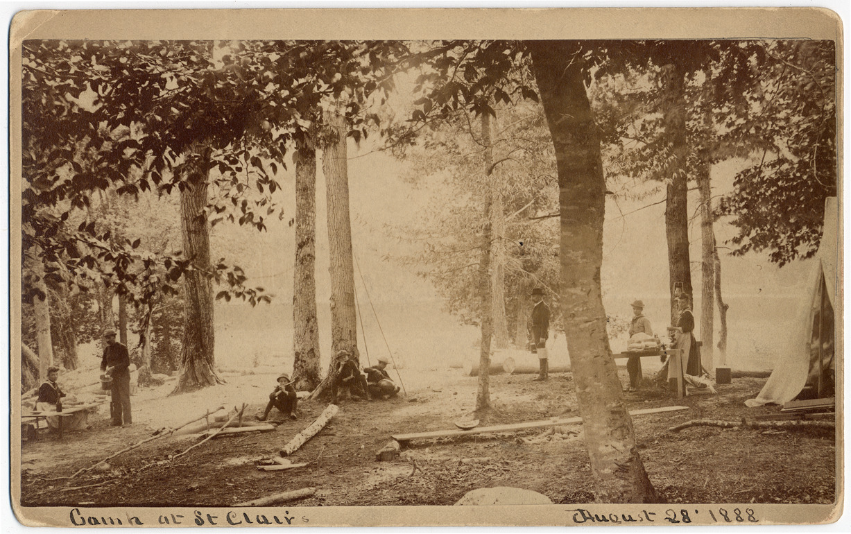 Favorite this☆ Camp at St. Clair, August 28, 1888 Description: Several people relaxing or working around campsite. Handwritten on photograph front: "Camp at St. Clair, August 28, 1888." Details Resource ID: DPA0594 Subject: Campers (Persons)--Michigan--Saint Clair Camp sites, facilities, etc.--Michigan--Saint Clair Cabinet photographs Albumen prints Photographic prints Date Issued: 1888-08-28 Format: 1 cabinet card ; image 4.5 x 8 in. Member of: Burton Historical Collection Filing Location: M/Localities-St. Clair Rights: Physical rights are retained by DPL. Copyright is retained in accordance with U.S. copyright laws.