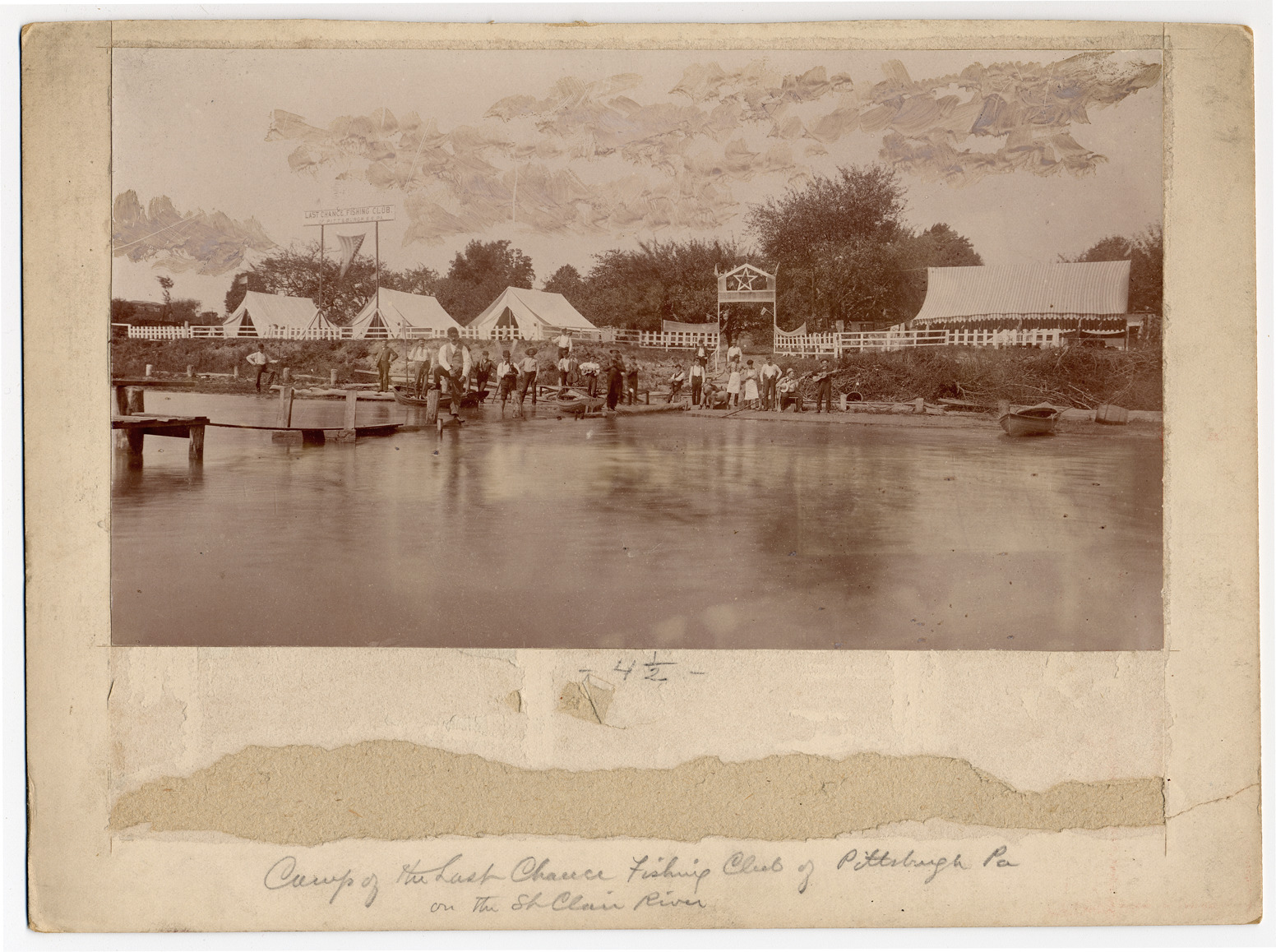Group of people on shore and docks, including musicians. Fence marks off area with large tents and dining fly, marked with large sign for the club. Scattered rowboats. Handwritten on mat front: "Camp of the Last Chance Fishing Club of Pittsburgh, Pa., on the St. Clair River." Handwritten on mat back: "Last Chance Hunting & Fishing Club of Pittsburg [sic] Pa. one mile above St Clair. Westrick."