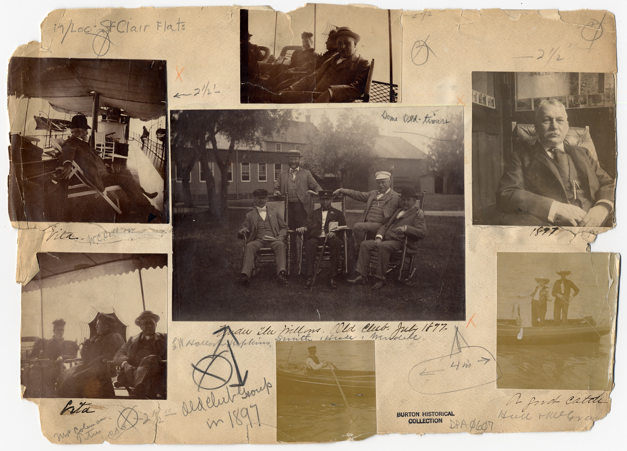 Six photographs on stock, whole labeled "Old Club Group in 1897": "W.C. Coleman" on boat deck; two women and man on veranda; four men sitting with one standing in front of club buildings, labeled "Under the Willows: Old Club 1897: L.W. Hall[ock?], Hopkins, Smith, Hull, W[endale?]"; older man sitting inside, labeled "1897"; two fishermen in boat, labeled "A Good Catch: Hull and McGraw"; man in rowboat; repeat of two women and one man sitting on veranda, different angle, labeled "Mrs. Coleman, Titus."