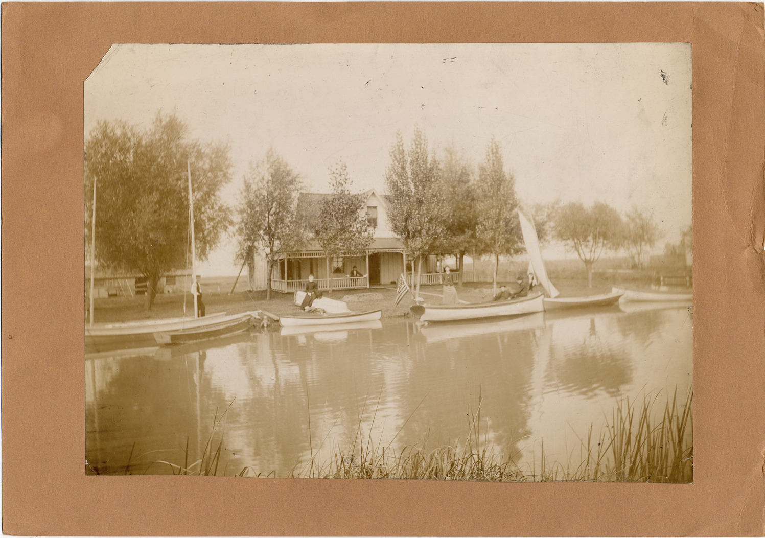 Cottage with wrap-around porch with moored boats. Man on porch, several people on lawn and on boats. Handwritten on mat back: "A summer home. Boats moored before the residence on made land."