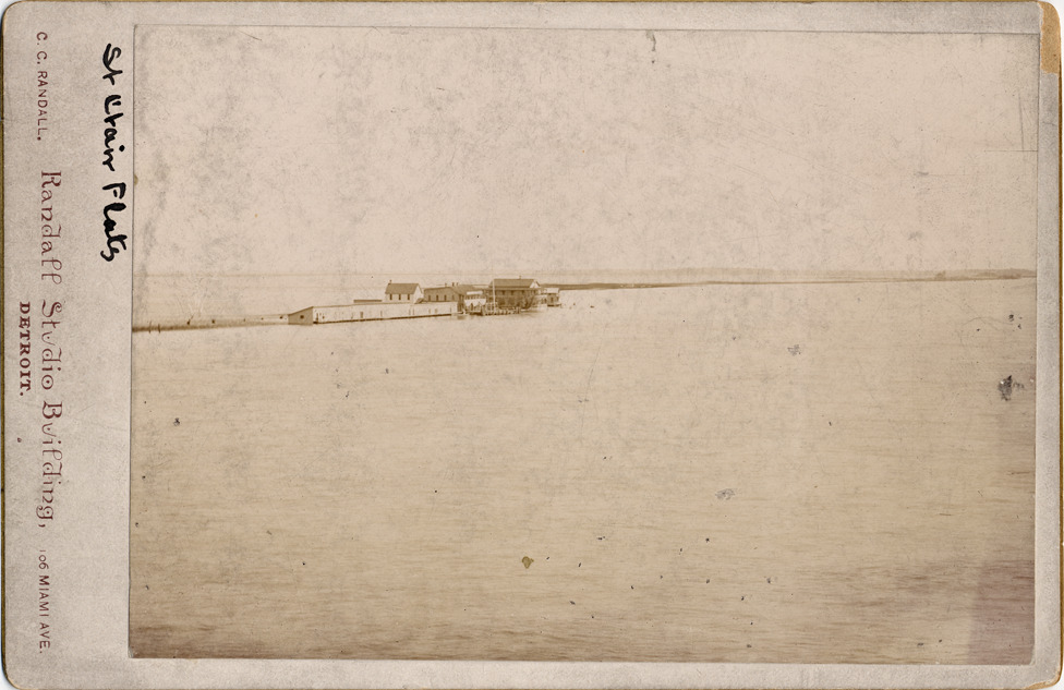 Buildings, docks, and boathouse in distance. Handwritten on cabinet card front: "St. Clair Flats." Printed on cabinet card front: "C.C. Randall, Randall Studio Building, 106 Miami Ave., Detroit."