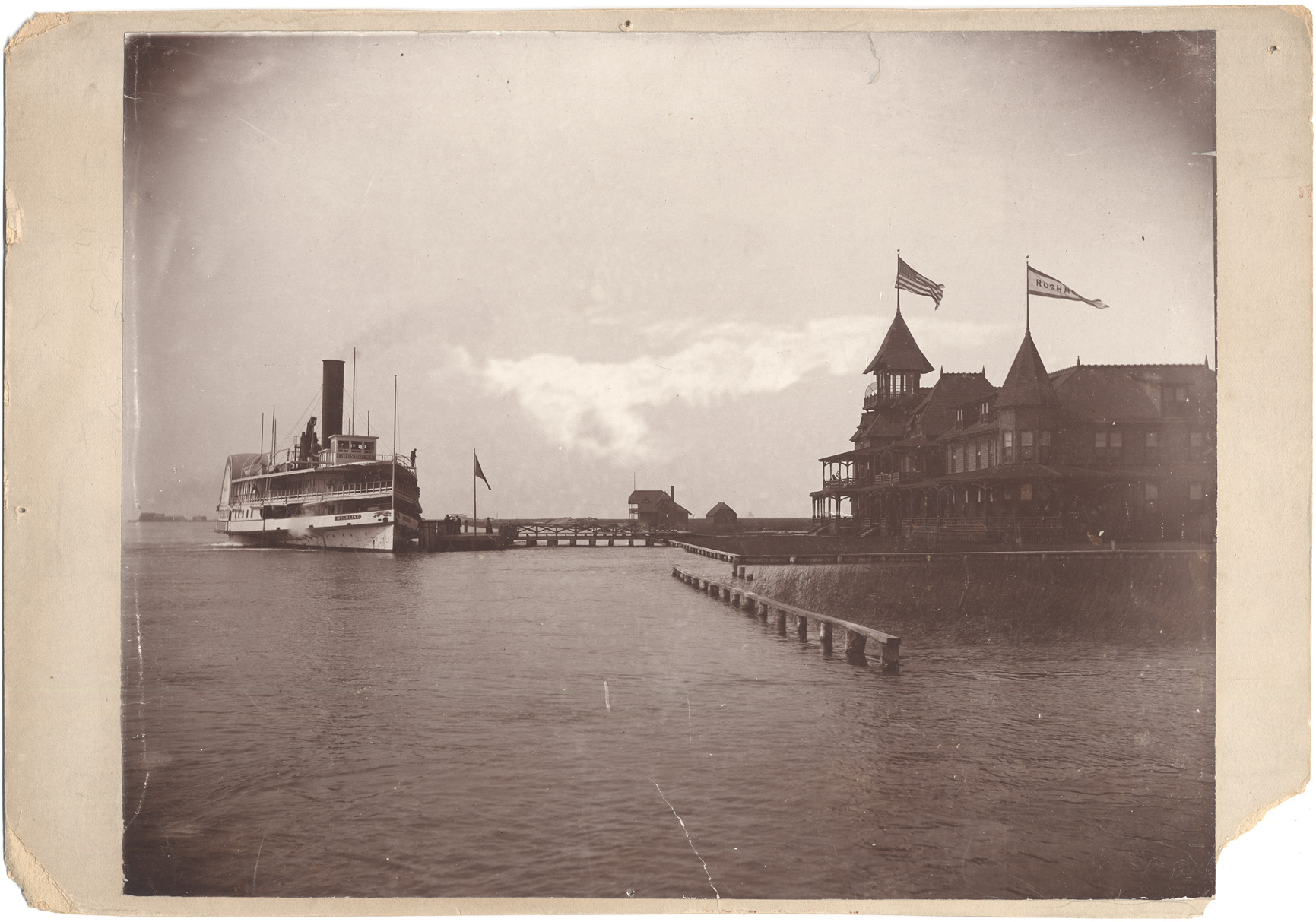Favorite this☆ Excursion boat "Greyhound ex Northwest" at Rushmere Description: Club buildings with excursion boat "Greyhound ex Northwest" docked. Other buildings visible. Handwritten on mat back: "The up-bound boat at 'Rushmere.'" Details Resource ID: DPA0658 Subject: Excursion boats--Michigan--Saint Clair County Steamboats--Michigan--Saint Clair County Boats and boating--Michigan--Saint Clair County Albumen prints Photographic prints Date Issued: Unknown year Format: 1 photographic print mounted on mat board ; image 7.75 x 9.75 in. Member of: Burton Historical Collection Filing Location: M/Localities-St. Clair Flats Rights: Physical rights are retained by DPL. Copyright is retained in accordance with U.S. copyright laws.