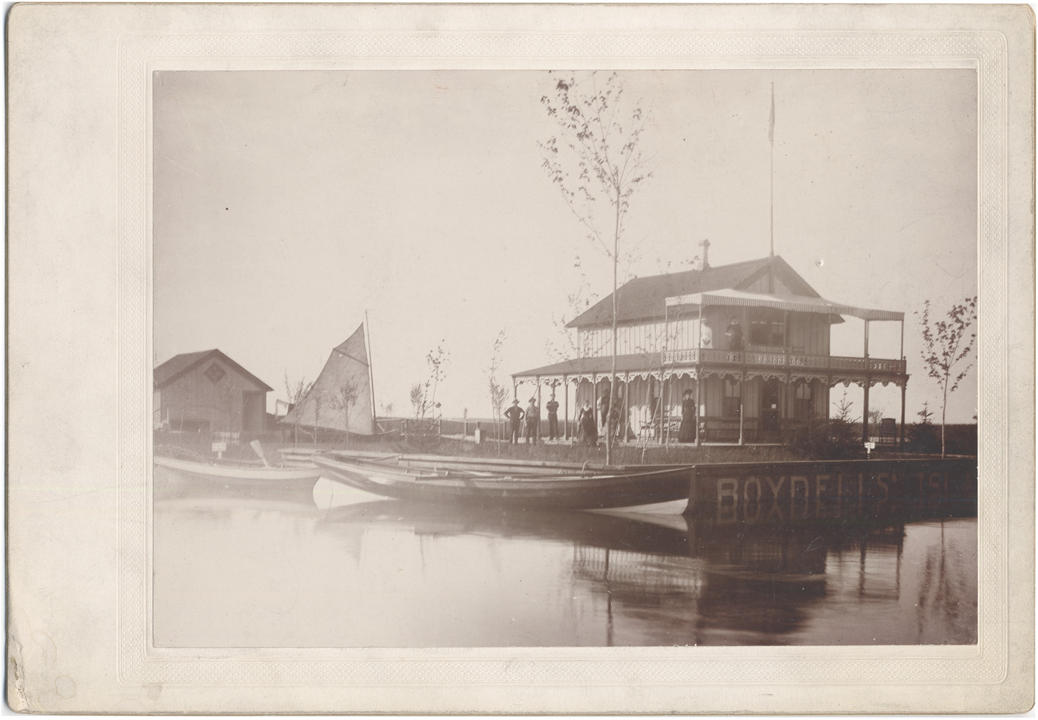 Small two-story building with scattered people on balcony and wrap-around porch. Gingerbread on porch supports, awning over balcony. Seawall with moored rowing and sailboats, another building in background. Small mostly leafless trees. Painted on seawall: "Boydell's Is[land?]."