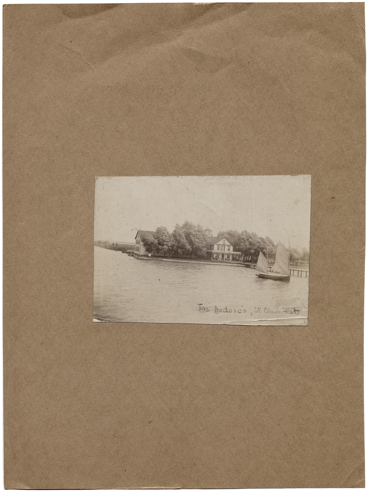 Favorite this☆ Joe Bedore's cottage Description: Large L-shaped building among mature trees, built close to seawall. Large porch leads onto dock. Two-masted sailboat luffing near end of dock. Handwritten on photograph: "Joe Bedore's, St. Clair Flats." Details Resource ID: DPA0662 Subject: Dwellings--Michigan--Saint Clair County Vacation homes--Michigan--Saint Clair County Docks--Michigan--Saint Clair County Boats and boating--Michigan--Saint Clair, Lake (Mich. and Ont.) Albumen prints Photographic prints Date Issued: Unknown year Format: 1 photographic print mounted on stock ; image 3.25 x 5 in. Member of: Burton Historical Collection Filing Location: M/Localities-St. Clair Flats Rights: Physical rights are retained by DPL. Copyright is retained in accordance with U.S. copyright laws.