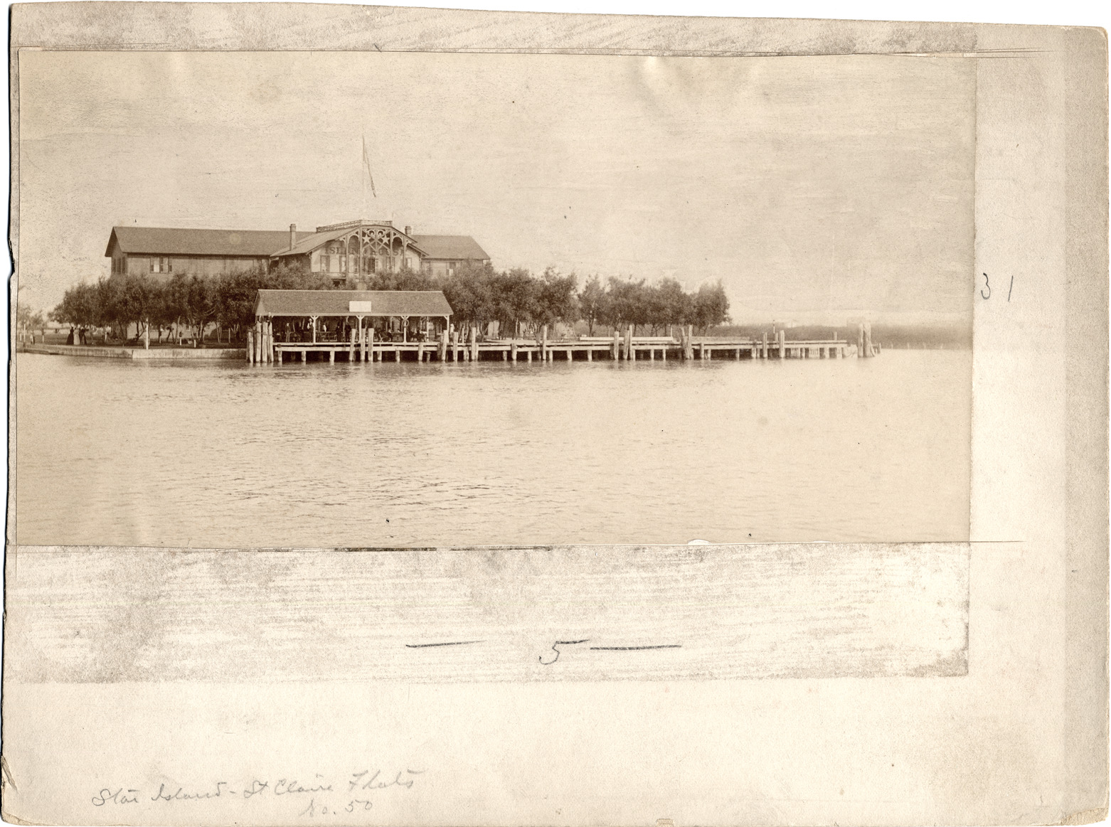View from across the water at the Star Island House hotel with boat dock in front of hotel at water's edge. Written on front of photo: "Star Island, St. Clair Flats." Stamped on photo back: "From Alvord & Co., exclusively, commercial photographers, 55 Rowland St., Detroit, Mich., ground floor."