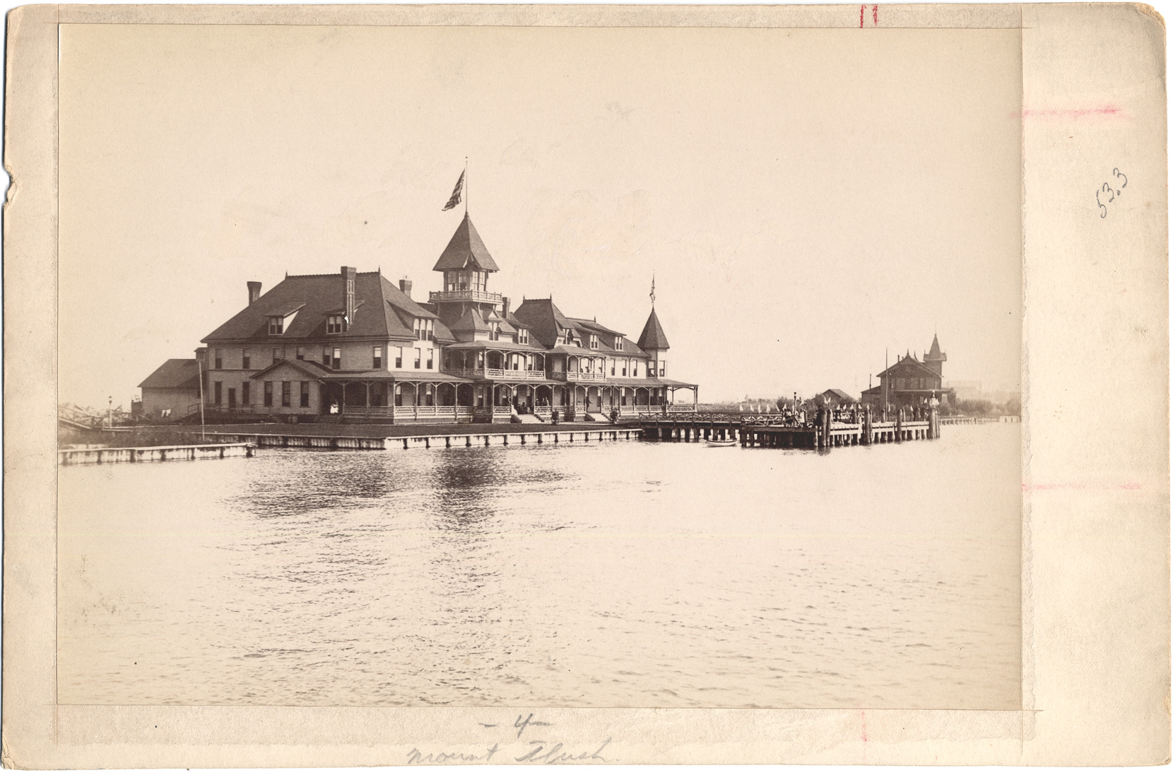 Large clubhouse with docks. Porch stretches across front, balcony about one-third of front. Other houses farther along shore. Stamped on mat back: "Alvord & Farmer, 55 Rowland St., Detroit, Mich." Handwritten on mat back: "'Rushmere' clubhouse, St. Clair Flats, 1890." Stamped on duplicate mat back: "From Alvord & Co., exclusively commercial photographers, 55 Rowland St., Detroit, Mich., ground floor." Handwritten on duplicate mat back: "Rushmore club house at the Flats."