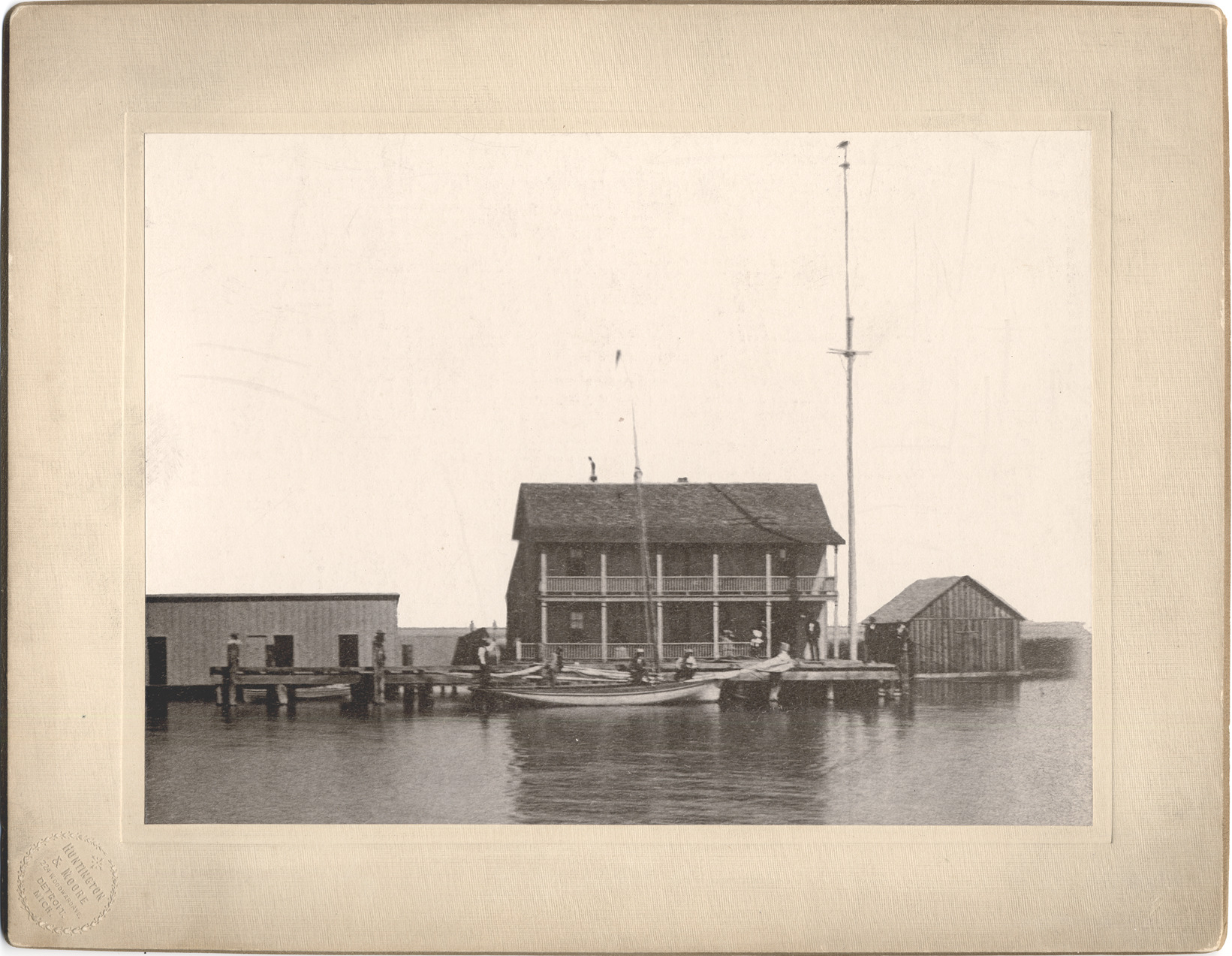 View from water to two-story club on seawall, porch and balcony full length of front. Two sailboats at dock. Several men on porch, dock, and boats. Embossed on mat front: "Huntington & Moore, 224 Woodward Ave., Detroit, Mich." Handwritten on mat back: "Old club about 1875. Photo by Jenney & Miller, enlarged by Huntington & Co., Detroit." Handwritten on duplicate mat back: "Old club, St. Clair Flats, 1873."