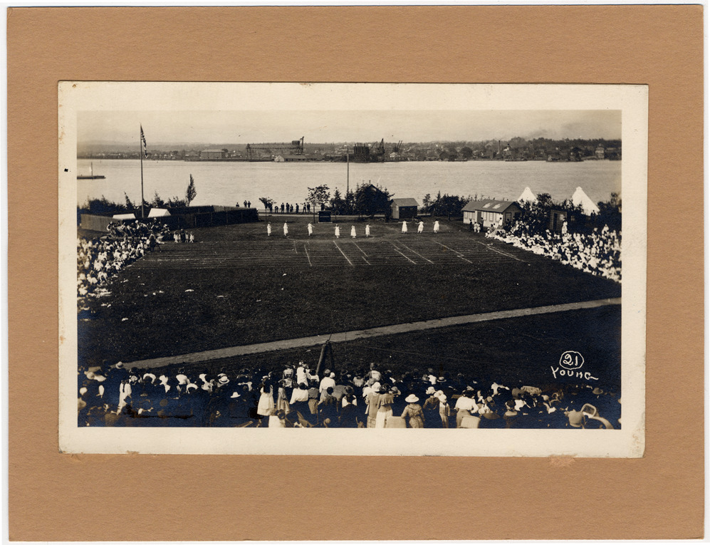 Nine dancers in field in pageant. Audience visible on three sides. Water visible beyond field. Handwritten on photograph front: "Young" with number 21 in a circle. Handwritten on mat back: "View of historical pageant celebrating the anniversary of the treaty made at Sault Ste. Marie between Gov. Lewis Cass and the Indians, June 15, 1820. Sault Ste. Marie, Mich, 1920."