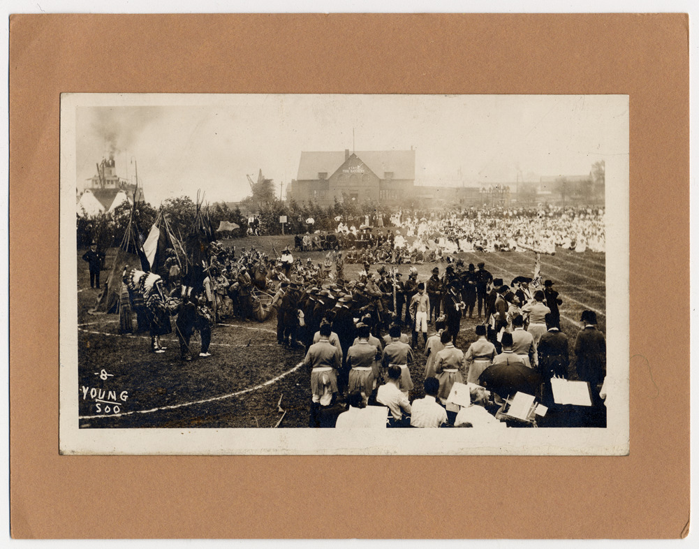 Costumed performers in groups: Indians, settlers, soldiers. Musicians in foreground. Audience across playing field. State Fish Hatchery building behind audience. Handwritten on photograph front: "-8- Young" with number 500 under line. Handwritten on mat back: "View of the historical pageant celebrating the anniversary of the treaty made at Sault Ste. Marie between Gov. Lewis Cass and the Indians, June 15, 1820. Sault Ste. Marie, Mich, 1920."
