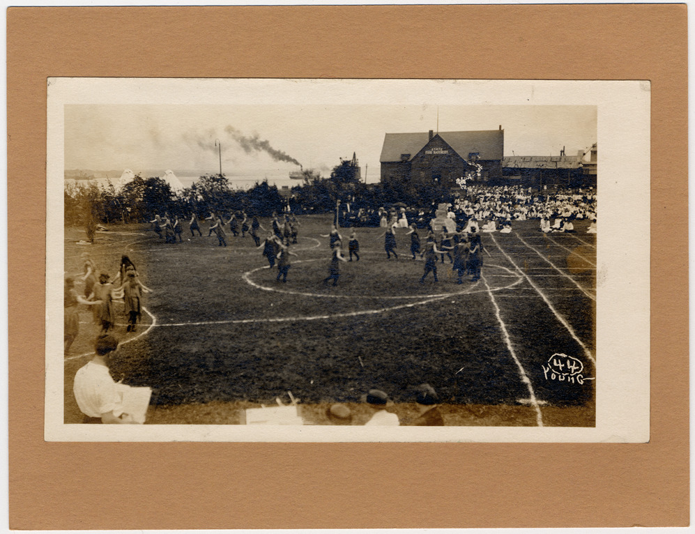 Costumed performers as Indians dancing on playing field. Musicians in foreground. Audience on opposite side of field, with State Fish Hatchery building behind. Handwritten on photograph front: "Young" with number 44 in a circle. Handwritten on mat back: "View of the historical pageant celebrating the anniversary of the treaty made at Sault Ste. Marie between Gov. Lewis Cass and the Indians, June 15, 1820. Sault Ste. Marie, Mich, 1920."