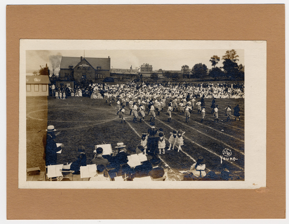 Scottish folk dancers performing on playing field. Group of young girls in costume with teacher between dancers and musicians. Audience on opposite side of field, with State Fish Hatchery building behind. Handwritten on photograph front: "Young" with number 16 in a circle. Handwritten on mat back: "View of the historical pageant celebrating the anniversary of the treaty made at Sault Ste. Marie between Gov. Lewis Cass and the Indians, June 15, 1820. Sault Ste. Marie, Mich, 1920."