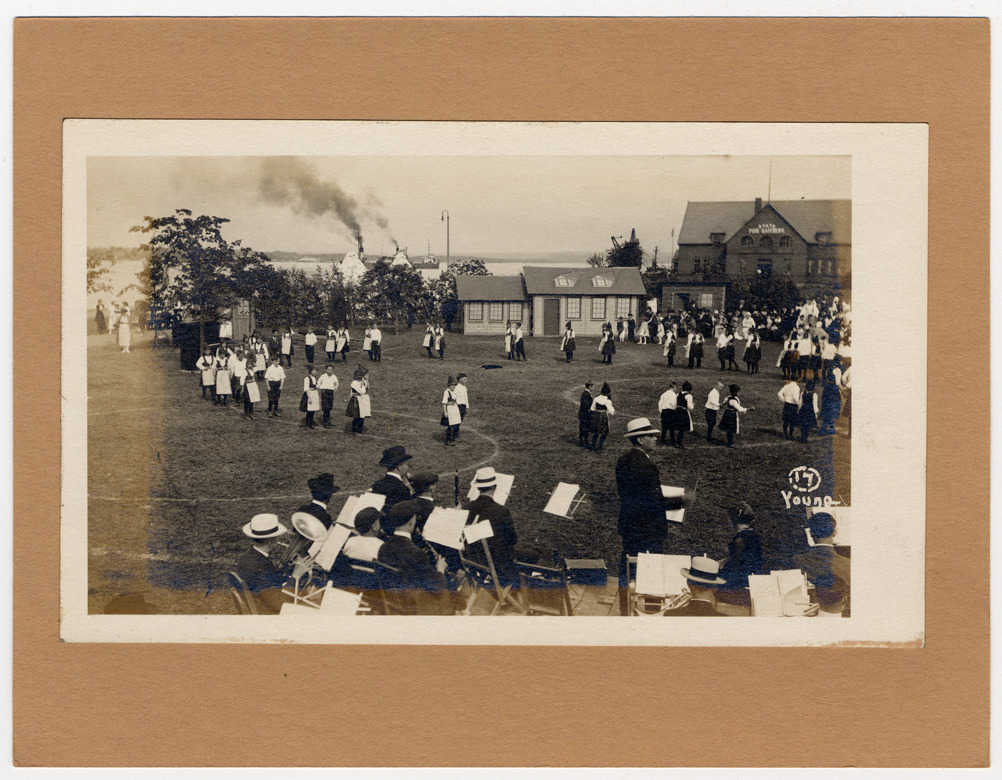 Costumed folk dancers dancing in circle on playing field in front of prop house. Musicians in foreground. Audience on opposite side of field, with State Fish Hatchery building behind. Handwritten on photograph front: "Young" with number 17 in a circle. Handwritten on mat back: "View of the historical pageant celebrating the anniversary of the treaty made at Sault Ste. Marie between Gov. Lewis Cass and the Indians, June 15, 1820. Sault Ste. Marie, Mich, 1920."