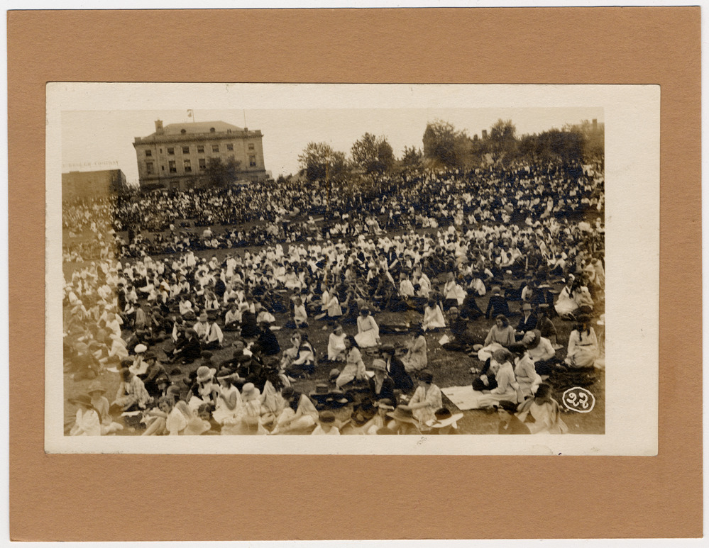 View of pageant audience sitting on lawn. Buildings in background. Handwritten on photograph front: "Young" with number 22 in a circle. Handwritten on mat back: "View of historical pageant celebrating the anniversary of the treaty made at Sault Ste. Marie between Gov. Lewis Cass and the indians, June 15, 1820. Sault Ste. Marie, Mich, 1920."