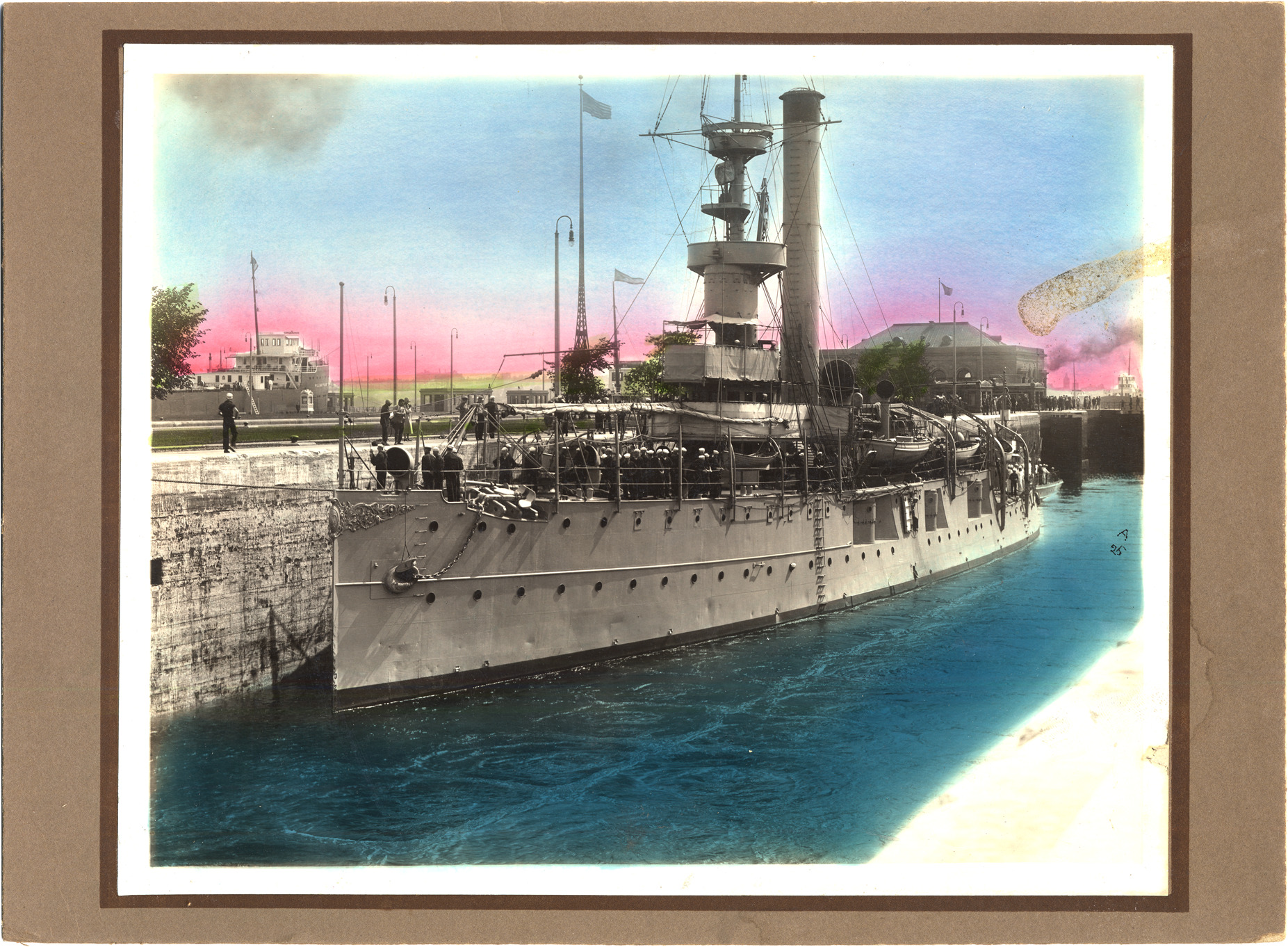Favorite this☆ U.S.S. Wilmington in the Soo Locks at Sault Ste. Marie Description: View of the U.S.S. Wilmington in the Soo Locks at Sault Ste. Marie, Michigan. Written on photo back: "Taken at the Soo, Dubuque?, shows Wm. P. Palmer in background." Details Resource ID: DPA0731 Subject: Soo Locks (Mich.) Wilmington (Ship) Warships--Michigan--Sault Sainte Marie Locks (Hydraulic engineering)--Michigan--Sault Sainte Marie Photographic prints Date Issued: Unknown year Format: 1 photographic print mounted on mat board : col. ; image 8.25 x 10 in. Member of: Burton Historical Collection Filing Location: M/Localities-Sault Ste. Marie Rights: Physical rights are retained by DPL. Copyright is retained in accordance with U.S. copyright laws.