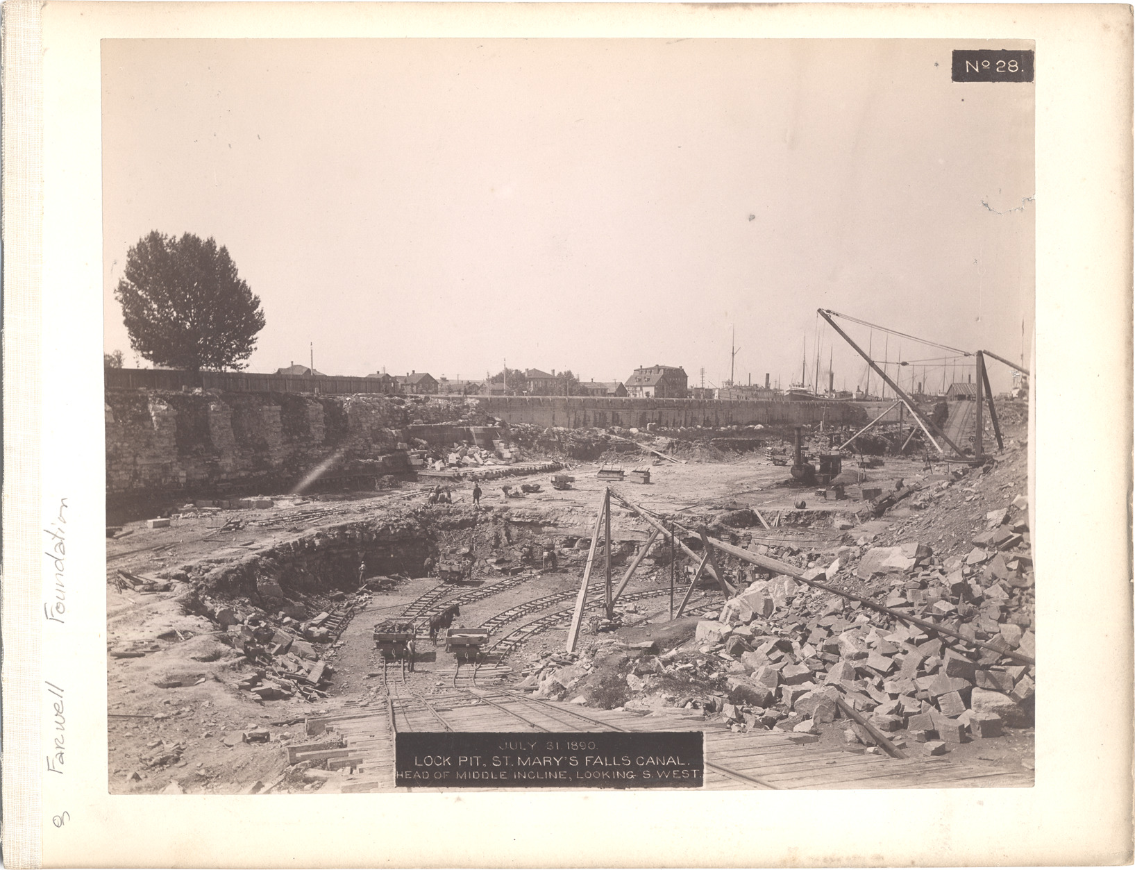 Construction site of St. Mary's Falls Canal lock pit, with railroad tracks and workers in pit and houses and ships in background. Printed on front of photo: "July 31, 1890 lock pit, St. Mary's Falls Canal, head of middle incline, looking s. west."