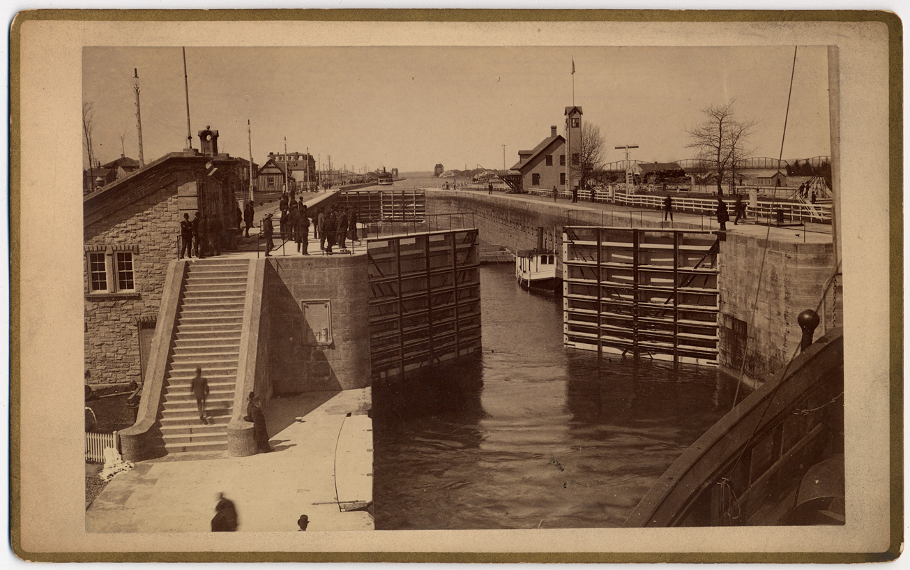Lock opening for approaching ship; photo taken from deck of ship. Tugboat seen in lock within. Crowd of onlookers on both sides of canal. Town in background, including International Bridge in right background. Printed on back: "W.J. Bell, portrait & landscape photographer, Sault Ste. Marie, Mich. Duplicates of this picture can be had at any time. All negatives preserved. Enlarging in India ink, crayon, water color and oil. Instantaneous process."