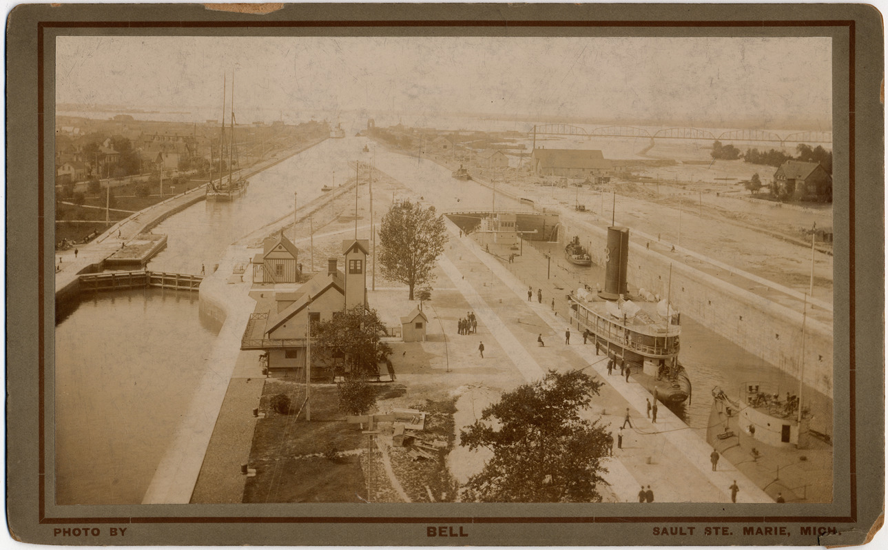 Overhead view of two branches of canal, including Soo Locks. Several small and medium-sized boats; onlookers on side of canal. Town in background, including International Bridge. Printed on front: "Photo by Bell, Sault Ste. Marie, Mich." Printed on back: "W.J. Bell, U.S. official landscape and portrait photographer, the leading city artist, proprietor Elite Studios, Branch Studios Bay Mills, Detour, and Pickford. Sault Ste. Marie, 13 and 13 1/2 Portage Avenue, P.O. Box 386, correspondance solicited." Includes long list of photographs available from studio: "Interior of locks--empty," "Vessels entering Locks from below, bound up," etc.