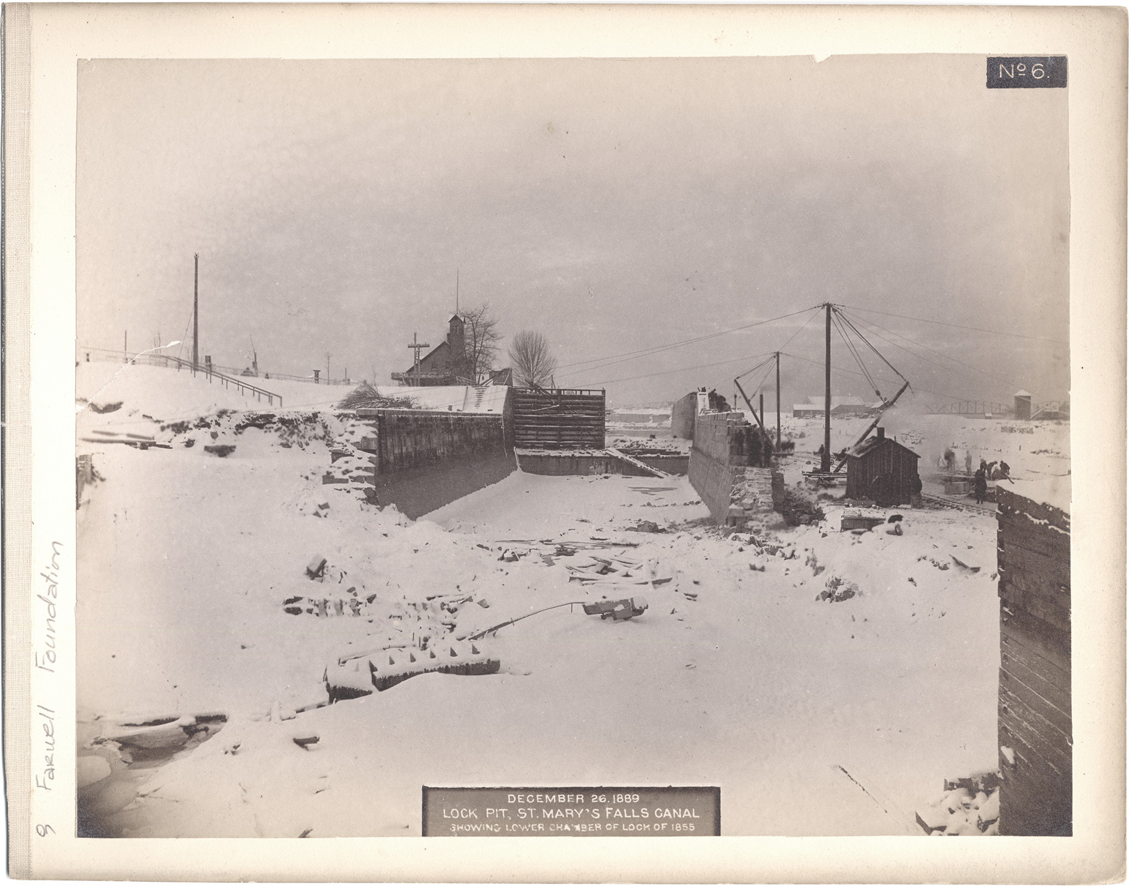 View of the lower chamber of the 1855 lock at St. Mary's Falls Canal covered with snow, with workmen by railroad tracks on right and bridge in background. Printed on front of photo: "December 26, 1889, Lock pit, St. Mary's Falls Canal, showing lower chamber of lock of 1855."