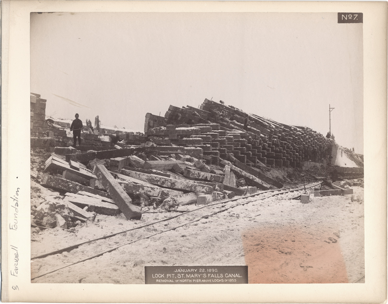 Large pile of wooden beams at the construction site of St. Mary's Falls Canal lock pit, with railroad tracks next to beams. Printed on front of photo: "January 22, 1890, Lock pit, St. Mary's Falls Canal, removal of north pier above locks of 1855."