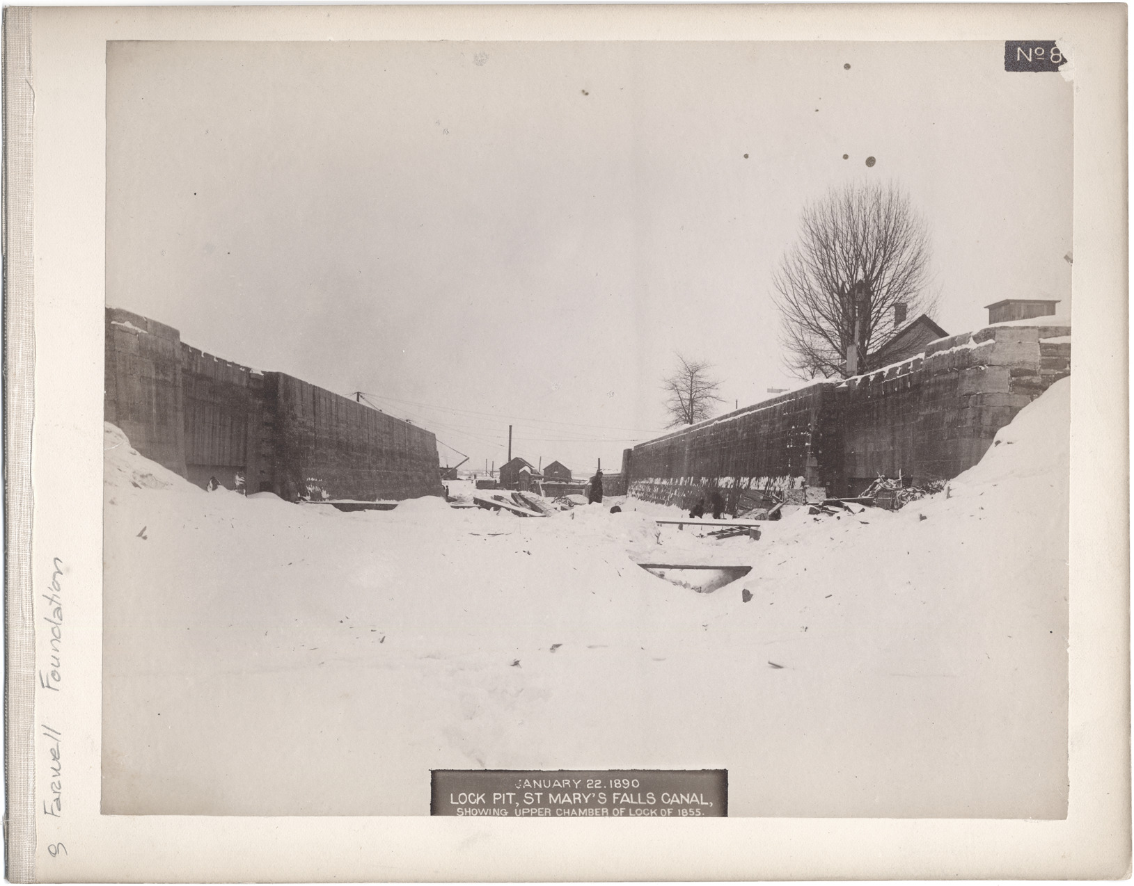 Construction site of St. Mary's Falls Canal lock pit, with workers in pit. Snow covers worksite. Printed on front of photo: "No. 8, January 22, 1890, lock pit, St. Mary's Falls Canal, showing upper chamber of lock of 1855."