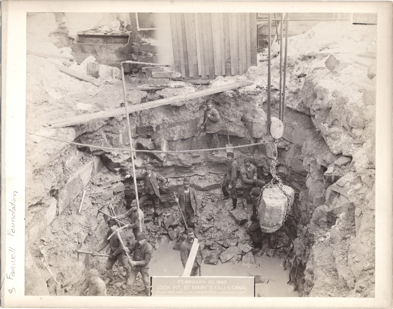 Construction site of St. Mary's Falls Canal lock pit showing workers with picks and shovels shifting rock and soil. Block and tackle being used to lift a large rock. Printed on front of photo: "No. 12, February 25, 1890, lock pit, St. Mary's Falls Canal, pumping well at lower end, looking east."