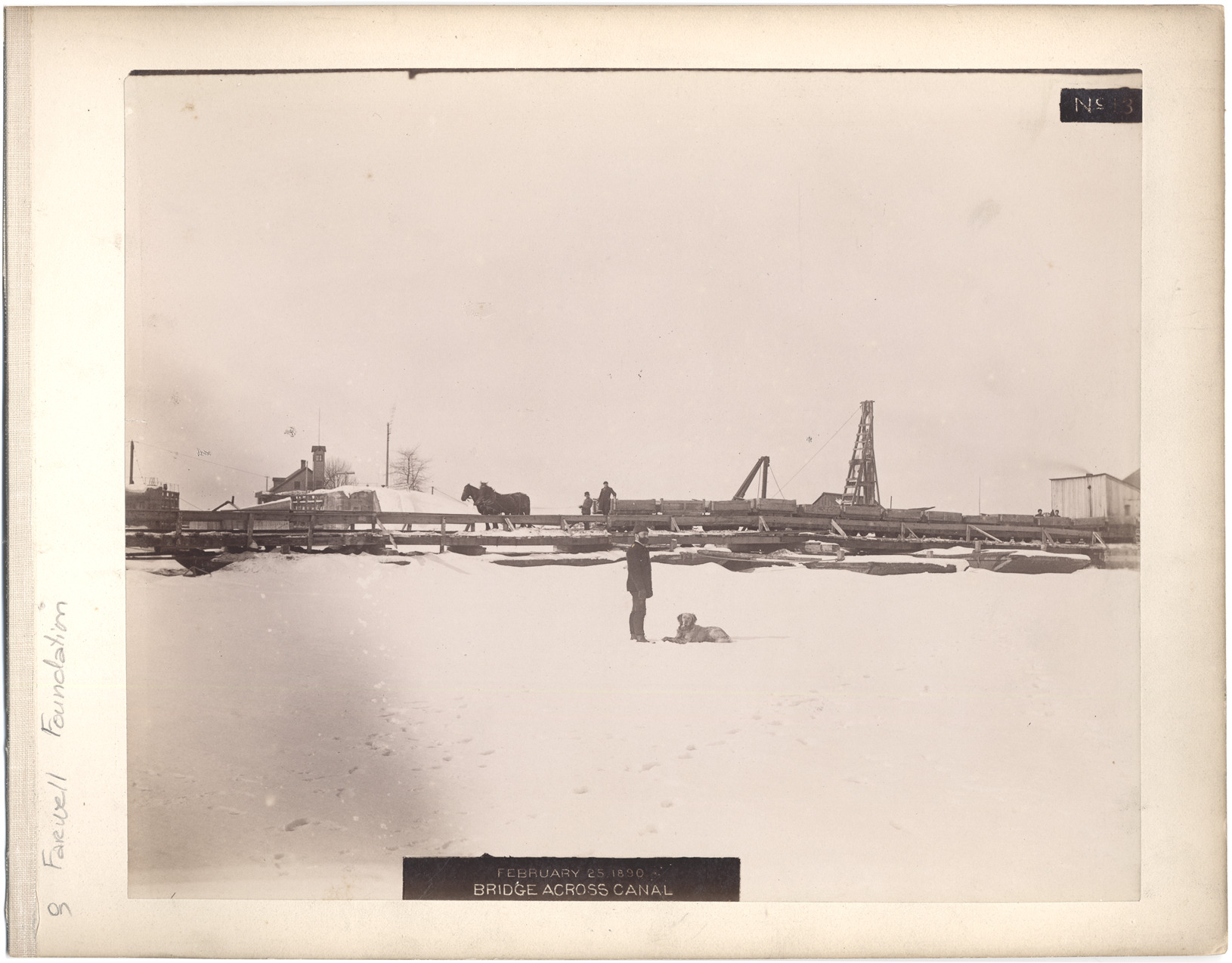 Construction site of St. Mary's Falls Canal on bridge across canal. Man and dog in mid-picture. Other workers, horse-drawn sledge, construction equipment, and buildings in background. Printed on front of photo: "No. 13, February 25, 1890, bridge across canal."