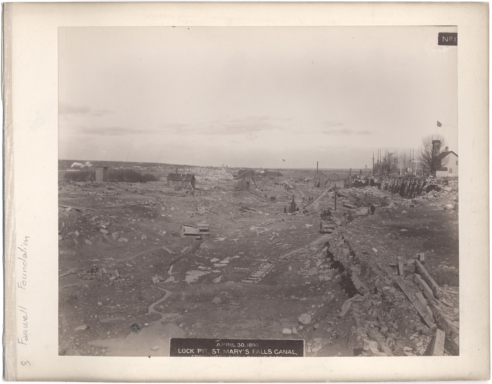 Construction site of St. Mary's Falls Canal lock pit showing workers along railroad tracks with horse-drawn cars. Buildings in background. Printed on front of photo: "No. 1[7?], April 30, 1890, lock pit, St. Mary's Falls Canal, from west end, looking east."