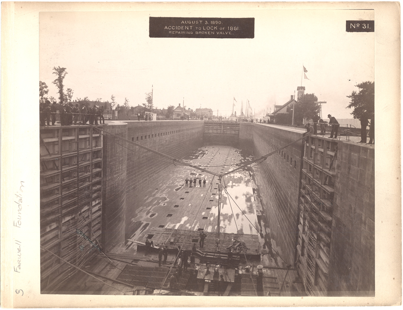 Construction site of St. Mary's Falls Canal showing repair of broken valve in existing lock. Scattered men on edge and in work area. Printed on front of photo: "No. 31, August 3, 1890, accident to lock of 1881, repairing broken valve."