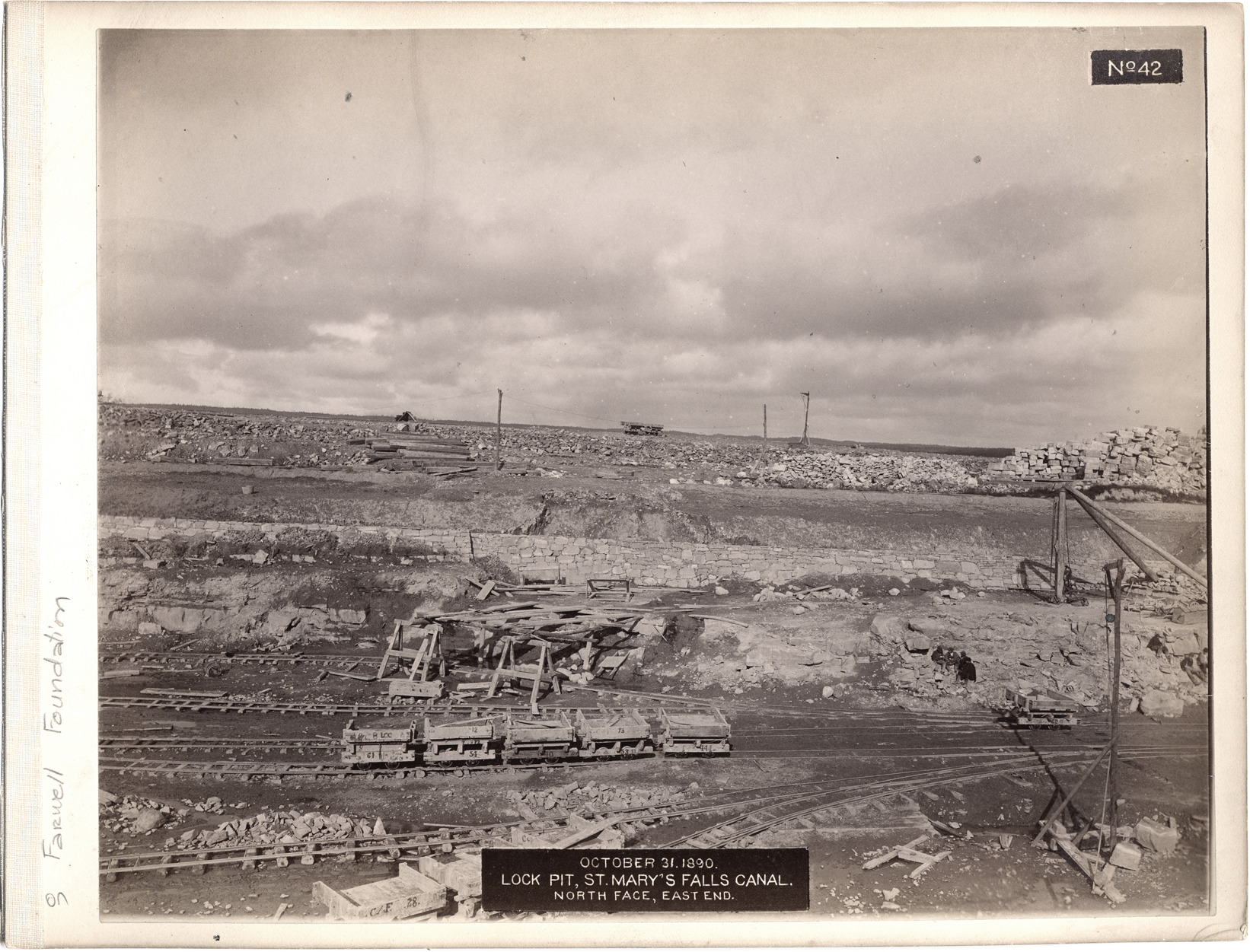 Construction site of St. Mary's Falls Canal lock pit showing railroad tracks, machinery, and workmen. Printed on front of photo: "No. 42, October 31, 1890, lock pit, St. Mary's Fall Canal, north face, east end."