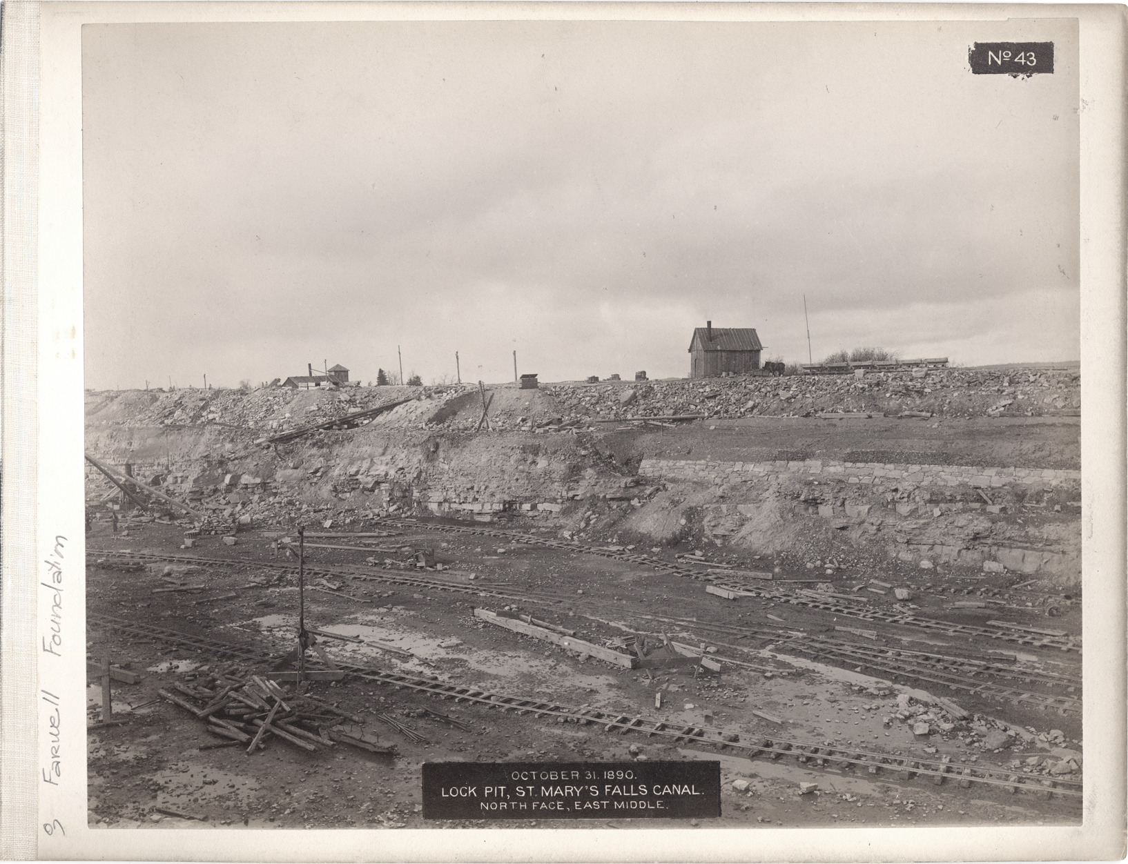 Construction site of St. Mary's Falls Canal lock pit showing railroad tracks, machinery, and workmen. Buildings on pit edge. Printed on front of photo: "No. 43, October 31, 1890, lock pit, St. Mary's Fall Canal, north face, east middle."