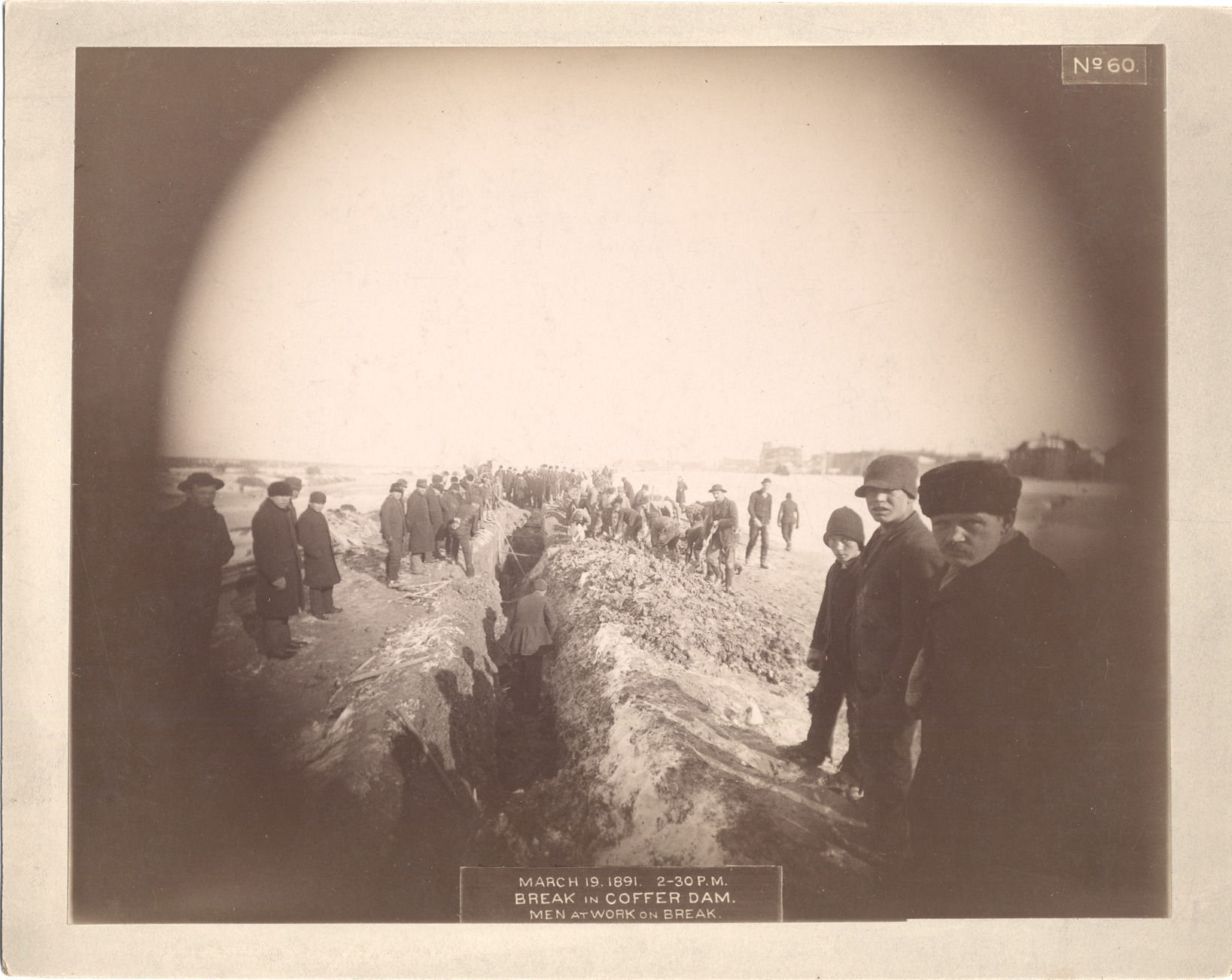 Men work to repair break in a cofferdam at Sault Ste. Marie. Printed on front of photo: "March 19, 1891, 2:30 pm, break in coffer dam, men at work on break." Stamped on photo back: "From the Elite and Bay Studios, 67 & 13 1/2 Portage Ave., W.J. Bell, proprietor, Sault Ste. Marie, Mich., headquarters for photos, views and art specialities."