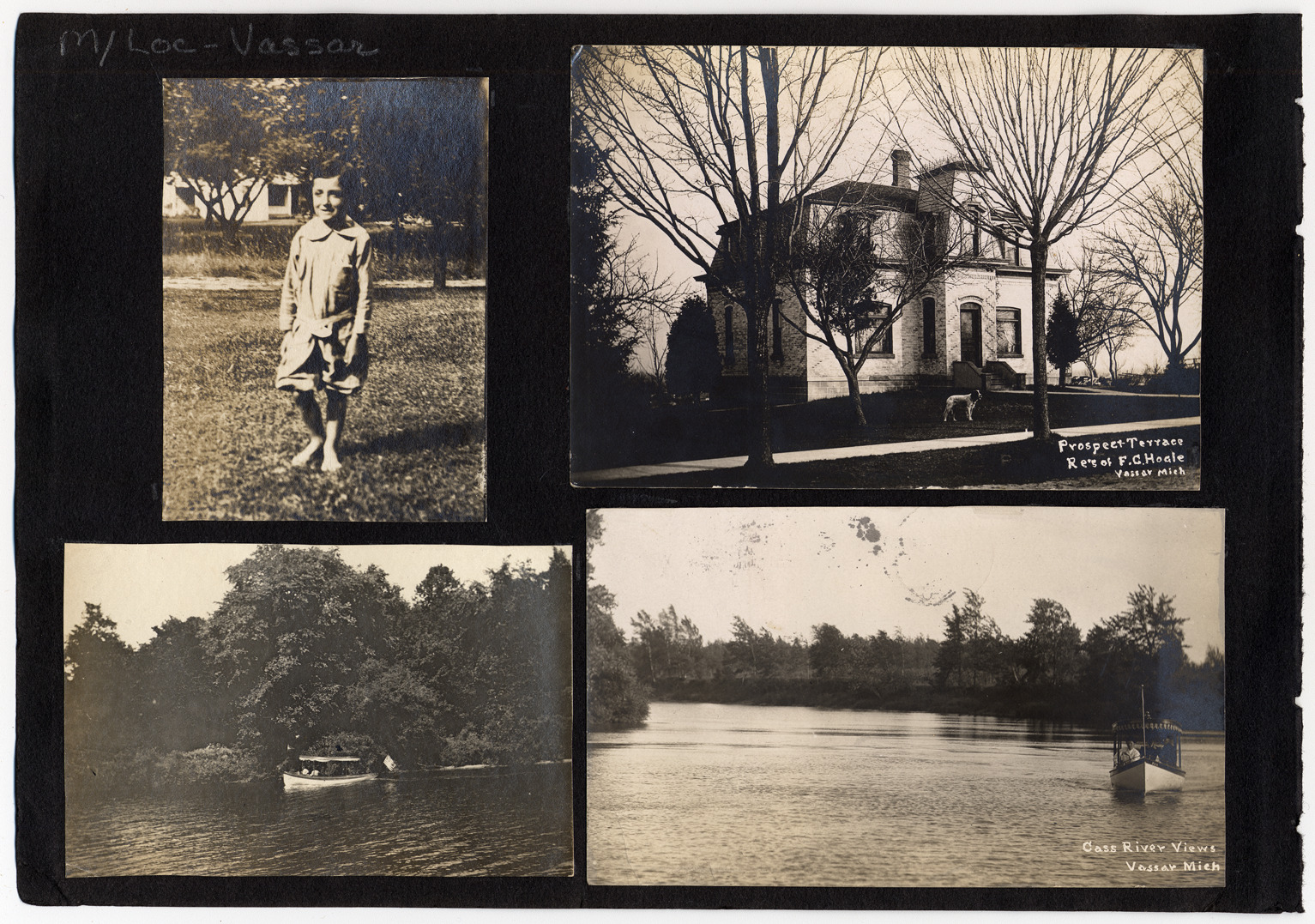Four photographs on stock paper, upper left is the image of a barefoot girl, upper right, the residence of F.C. Hoale, a Second Empire Victorian house, with dog and trees in front, lower left, a boat on the Cass River with trees in background, lower right, boat on the Cass River with trees in background. Written on front of upper right photo: "Prospect Terrace, res. of F.C. Hoale, Vassar, Mich." Written on front of lower right photo: "Cass River view, Vassar, Mich."