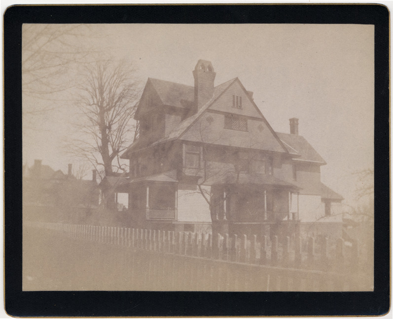 Three-story clapboard house behind picket fence, leafless trees and other buildings visible. Handwritten on mat back: "Mrs. Elizabeth Aubrey's residence, Wyandotte, 1893."