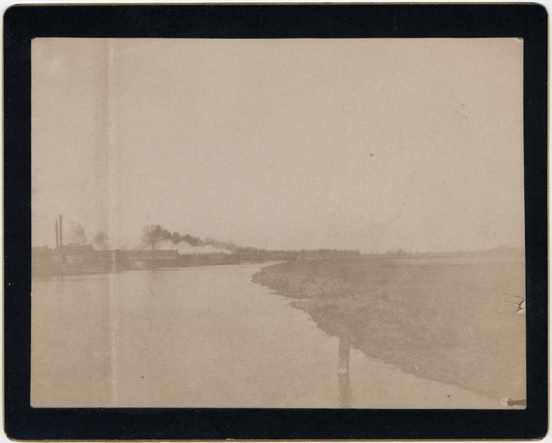 Stretch of the Detroit River with factory buildings on far bank. Printed on mat back: "J.C. Cristy, photographer, Detroit, Mich."