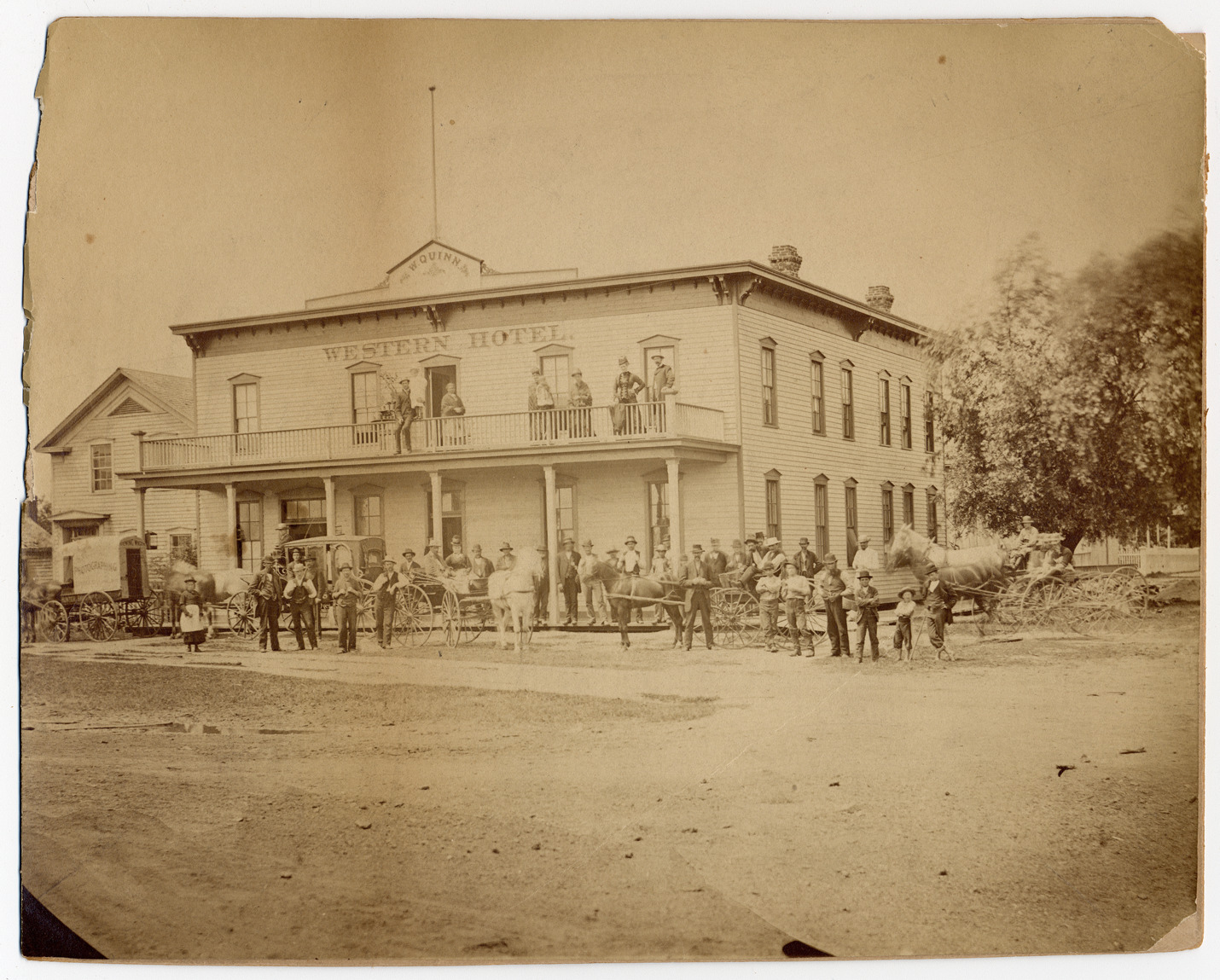 Exterior of two-story clapboard hotel with upper and lower porches across the front. Proprietor's family on upper porch, a large number of people on lower porch and on street. Three horse-drawn carriages and two horse-drawn trucks. Typed on label on mat back: "Right to left: "William Quinn, Prop'r, Mrs. William Quinn, daughter Lillian Quinn, daughter Maggie Quinn." Handwritten on mat back: "Wyandotte, Mich., Western Hotel, showing on upper porch, corner of Biddle, Third & Orange, Mrs. John F. Miller (nee Heider[?]), Detroit."