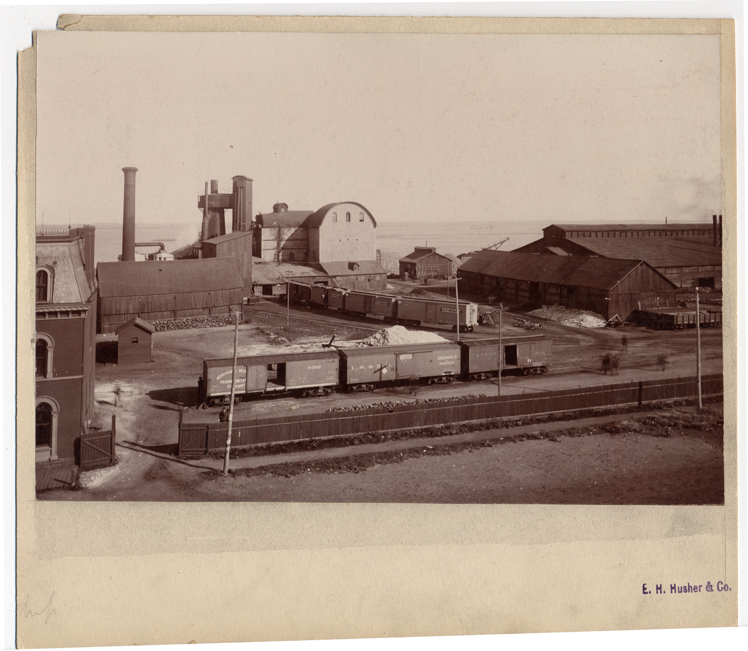 Steel mill buildings with railroad cars on tracks, river beyond. Stamped on mat front: "E.H. Husher & Co." Handwritten on mat back: "Wyandotte Rolling Mills, 183."