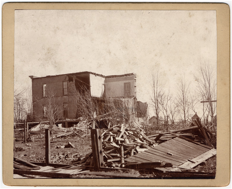 Favorite this☆ Damage from 1893 Ypsilanti cyclone Description: Brick building with walls torn off, rubble in surroundings. Trees and houses visible in background. Handwritten on mat back: "Ypsilanti cyclone 1893." Details Resource ID: DPA0862 Subject: Tornado damage--Michigan--Ypsilanti Dwellings--Michigan--Ypsilanti Rubble--Michigan--Ypsilanti Albumen prints Photographic prints Date Issued: 1893-04 Format: 1 photographic print mounted on mat board ; image 4 x 4.75 in. Member of: Burton Historical Collection Filing Location: M/Localities-Ypsilanti Rights: Physical rights are retained by DPL. Copyright is retained in accordance with U.S. copyright laws.