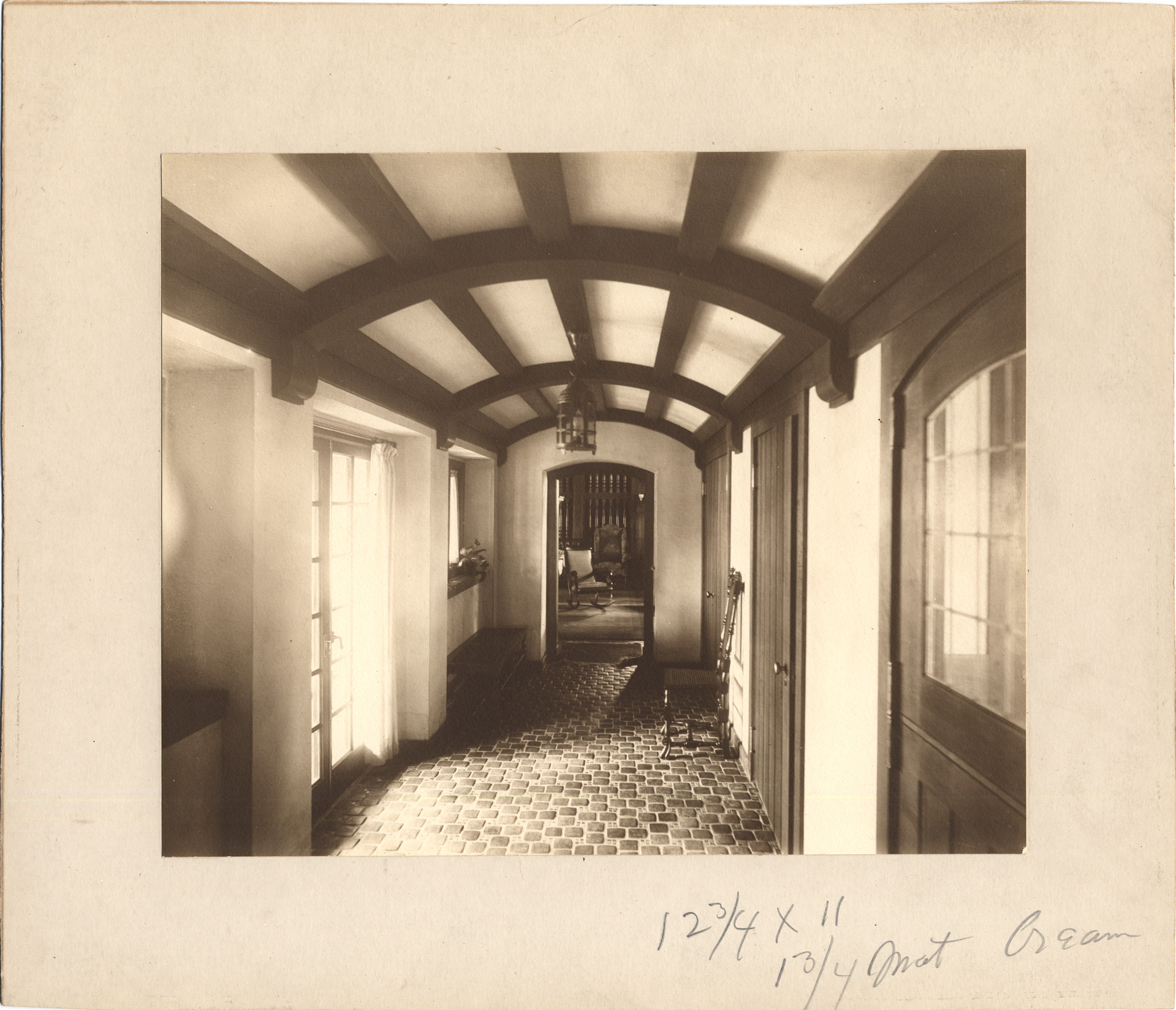 Hallway with arched false beamed ceiling. Bright light through French doors. another room through arched doorway. Handwritten on mat back: "Col. Edwin S. George home, now Kirk-in-the-Hills."