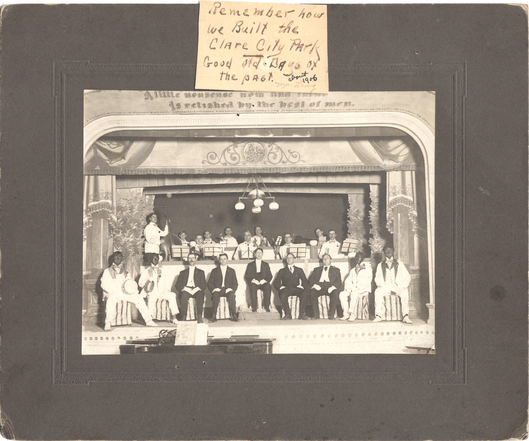 Nine men sitting on stage, four in blackface. Band behind them. Written across stage opening: "A little nonsense now and then, is relished by the best of men." Handwritten on card stapled to mat: "Remember how we built the Clare City Park. Good old days of the past. About 1906. Mr. Lang."