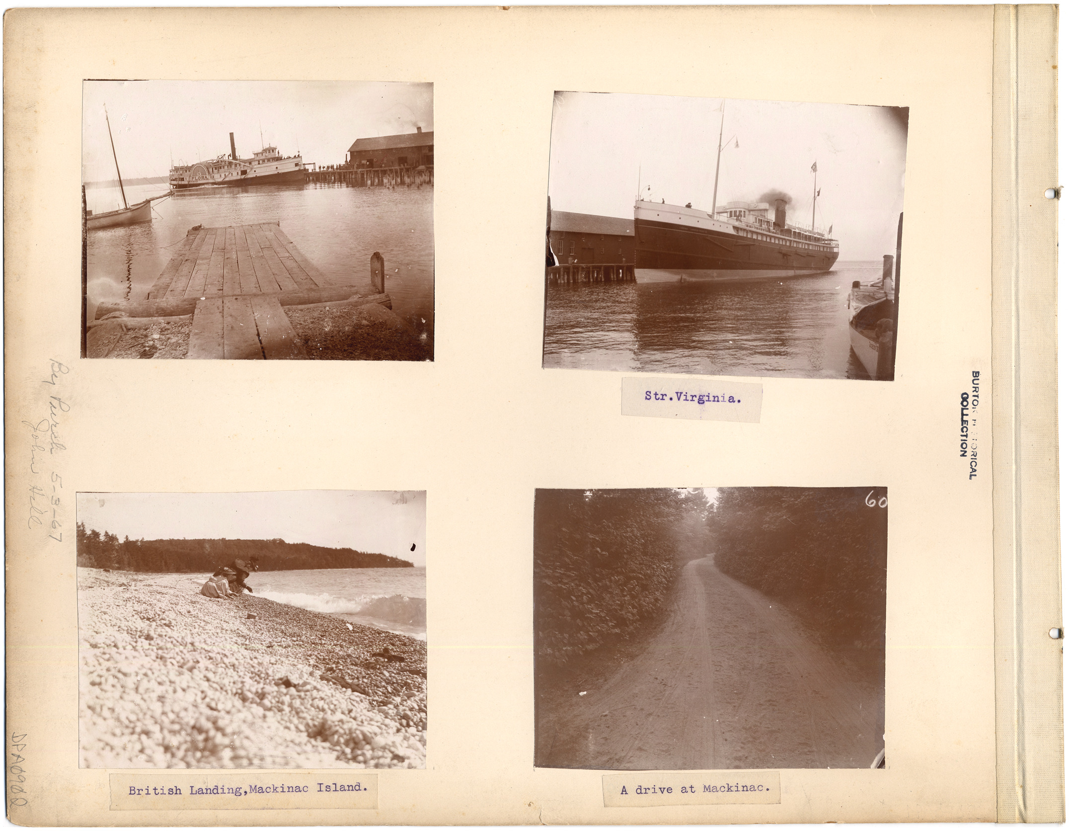 Four photographs on page taken from photograph album. Ferry Flora at dock, viewed from another dock; "Str. Virginia" at ferry dock; woman and girl beachcombing, labeled "British Landing, Mackinac Island"; unpaved road through trees, labeled "A drive at Mackinac."
