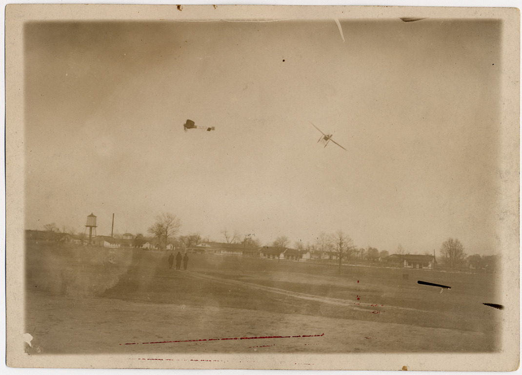 Two aerobatic planes over airfield. Three men stand in field. Buildings and trees in background. Typed on photograph back: "Rene Simon and Rene Barrier of the Moisant Aviators playing tag in Moisant monoplanes." Handwritten on photograph back: "1912 or 1913."